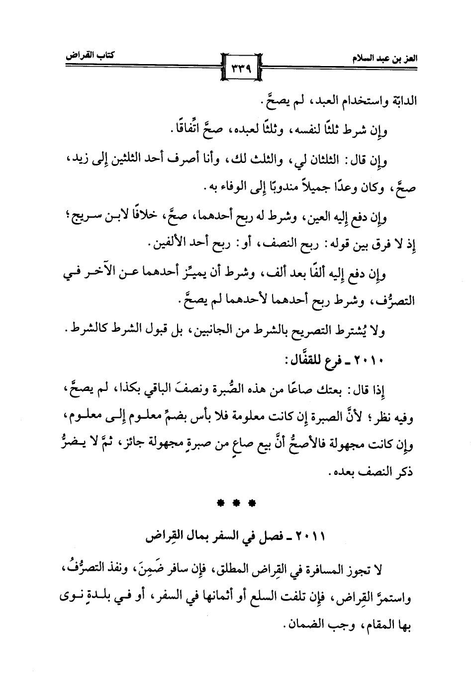 لا تجوز المسافرة في القِراض المطلق، فإِن سافر ضَمِنَ، ونفذ التصرُّفُ، واستمرَّ القِراض، فإِن تلفت السلع أو أثمانها في السفر، أو في بلدةٍ نوى بها المقام، وجب الضمان.