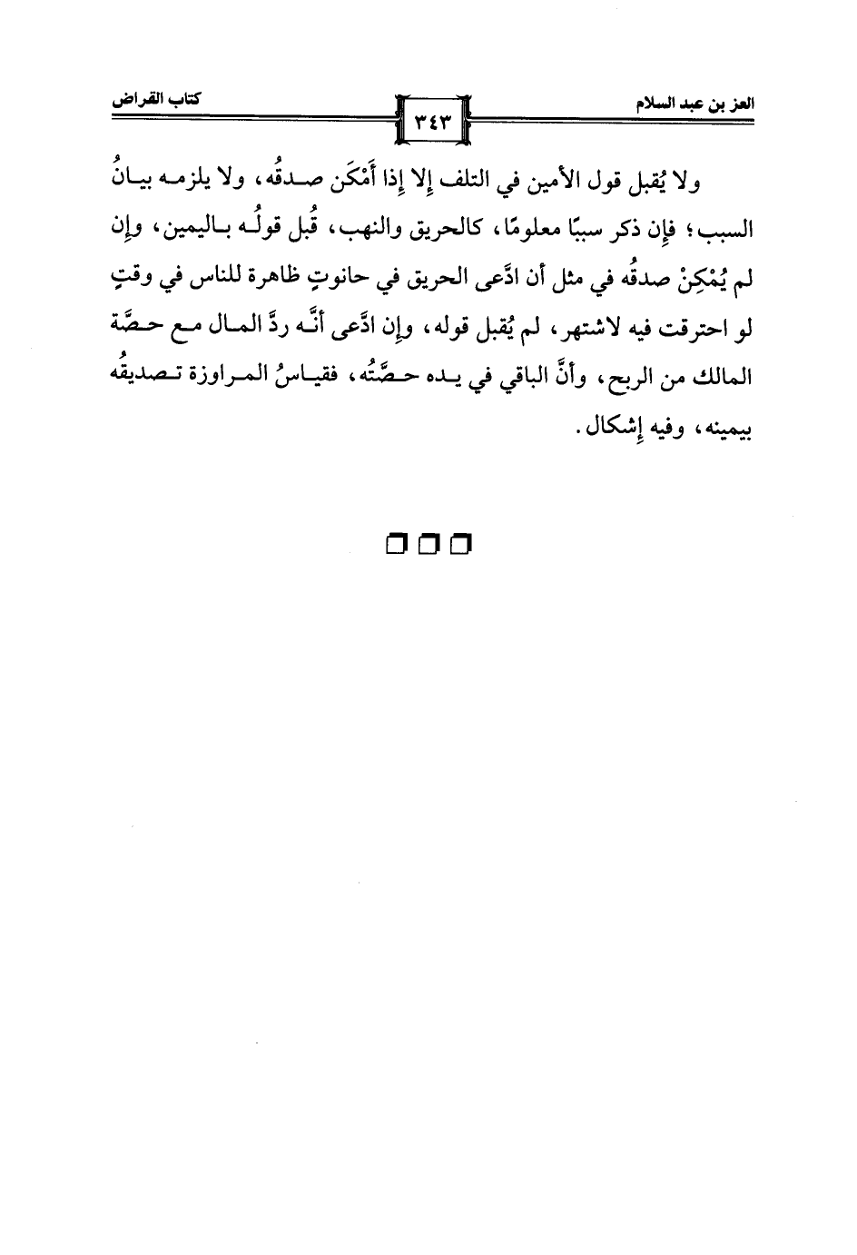ولا يُقبل قول الأمين في التلف إِلا إِذا أَمْكَن صدقُه، ولا يلزمه بيانُ السبب؛ فإِن ذكر سببًا معلومًا، كالحريق والنهب، قُبل قولُه باليمين، وإِن لم يُمْكِنْ صدقُه في مثل أن ادَّعى الحريق في حانوتٍ ظاهرة للناس في وقتٍ لو احترقت فيه لاشتهر، لم يُقبل قوله، وإِن ادَّعى أنَّه ردَّ المال مع حصَّة المالك من الربح، وأنَّ الباقي في يده حصَّتُه، فقياسُ المراوزة تصديقُه بيمينه، وفيه إِشكال.