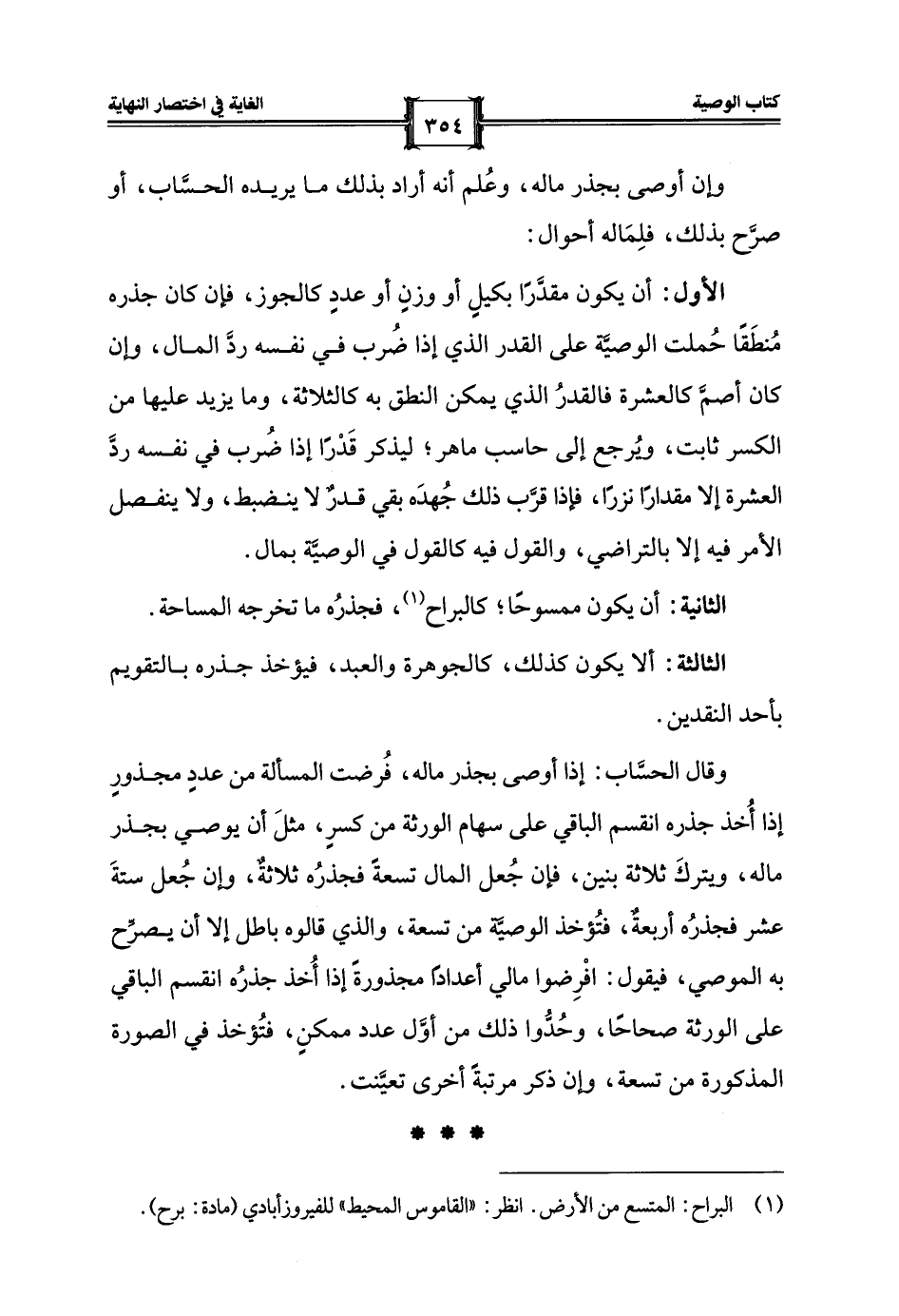 وقال الحسَّاب: إذا أوصى بجذر ماله، فُرضت المسألة من عددٍ مجذورٍ إذا أُخذ جذره انقسم الباقي على سهام الورثة من كسرٍ، مثلَ أن يوصي بجذر ماله، ويتركَ ثلاثة بنين، فإن جُعل المال تسعةً فجذرُه ثلاثةٌ، وإن جُعل ستةَ عشر فجذرُه أربعةٌ، فتُؤخذ الوصيَّة من تسعة، والذي قالوه باطل إلا أن يصرِّح به الموصي، فيقول: افْرِضوا مالي أعدادًا مجذورةً إذا أُخذ جذرُه انقسم الباقي على الورثة صحاحًا، وحُدُّوا ذلك من أوَّل عدد ممكنٍ، فتُؤخذ في الصورة المذكورة من تسعة، وإن ذكر مرتبةً أخرى تعيَّنت.