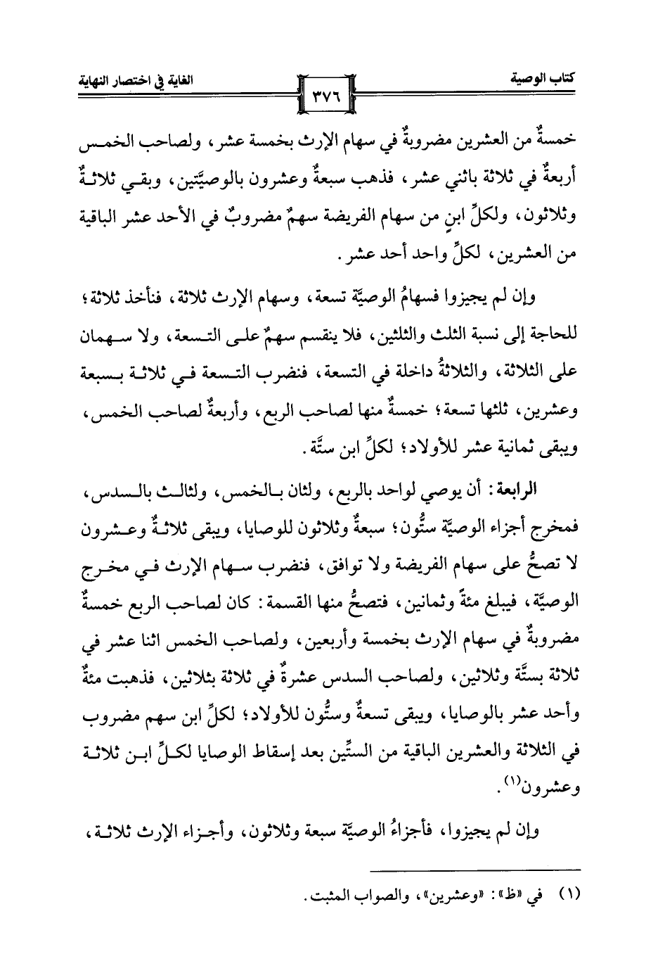 الرابعة: أن يوصي لواحد بالربع، ولثان بالخمس، ولثالث بالسدس، فمخرج أجزاء الوصيَّة ستُّون؛ سبعةٌ وثلاثون للوصايا، ويبقى ثلاثةٌ وعشرون لا تصحُّ على سهام الفريضة ولا توافق، فنضرب سهام الإرث في مخرج الوصيَّة، فيبلغ مئةً وثمانين، فتصحُّ منها القسمة: كان لصاحب الربع خمسةٌ مضروبةٌ في سهام الأرث بخمسة وأربعين، ولصاحب الخمس اثنا عشر في ثلاثة بستَّة وثلاثين، ولصاحب السدس عشرةٌ في ثلاثة بثلاثين، فذهبت مئةٌ وأحد عشر بالوصايا، ويبقى تسعة وستُّون للأولاد؛ لكلِّ ابن سهم مضروب في الثلاثة والعشرين الباقية من الستِّين بعد إسقاط الوصايا لكلِّ ابن ثلاثة وعشرون (¬1).