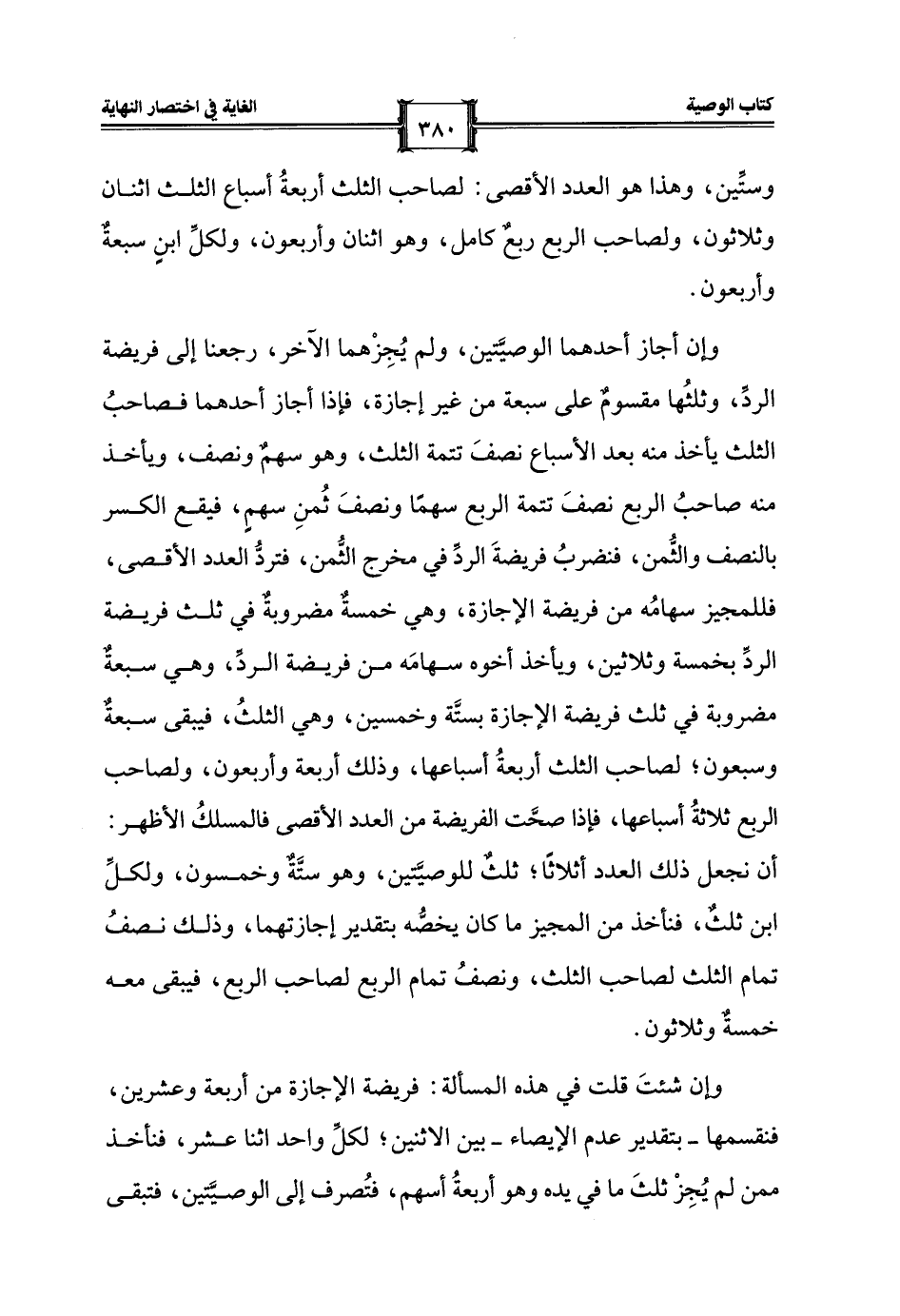 وإن أجاز أحدهما الوصيَّتين، ولم يُجِزْهما الآخر، رجعنا إلى فريضة الردِّ، وثلثُها مقسومٌ على سبعة من غير إجازة، فإذا أجاز أحدهما فصاحبُ الثلث يأخذ منه بعد الأسباع نصفَ تتمة الثلث، وهو سهمٌ ونصف، ويأخذ منه صاحبُ الربع نصفَ تتمة الربع سهمًا ونصفَ ثُمنِ سهيم، فيقع الكسر بالنصف والثمن، فنضربُ فريضةَ الردِّ في مخرج الثُّمن، فتردُّ العدد الأقصى، فللمجيز سهامُه من فريضة الإجازة، وهي خمسةٌ مضروبةٌ في ثلث فريضة الردِّ بخمسة وثلاثين، ويأخذ أخوه سهامَه من فريضة الردِّ، وهي سبعةٌ مضروبة في ثلث فريضة الإجازة بستَّة وخمسين، وهي الثلثُ، فيبقى سبعةٌ وسبعون؛ لصاحب الثلث أربعةُ أسباعها، وذلك أربعة وأربعون، ولصاحب الربع ثلاثةُ أسباعها، فإذا صحَّت الفريضة من العدد الأقصى فالمسلكُ الأظهر: أن نجعل ذلك العدد أثلاثا؛ ثلثٌ للوصيَّتين، وهو ستَّةٌ وخمسون، ولكلِّ ابن ثلثٌ، فنأخذ من المجيز ما كان يخصُّه بتقدير إجازتهما، وذلك نصفُ تمام الثلث لصاحب الثلث، ونصفُ تمام الربع لصاحب الربع، فيبقى معه خمسةٌ وثلاثون.