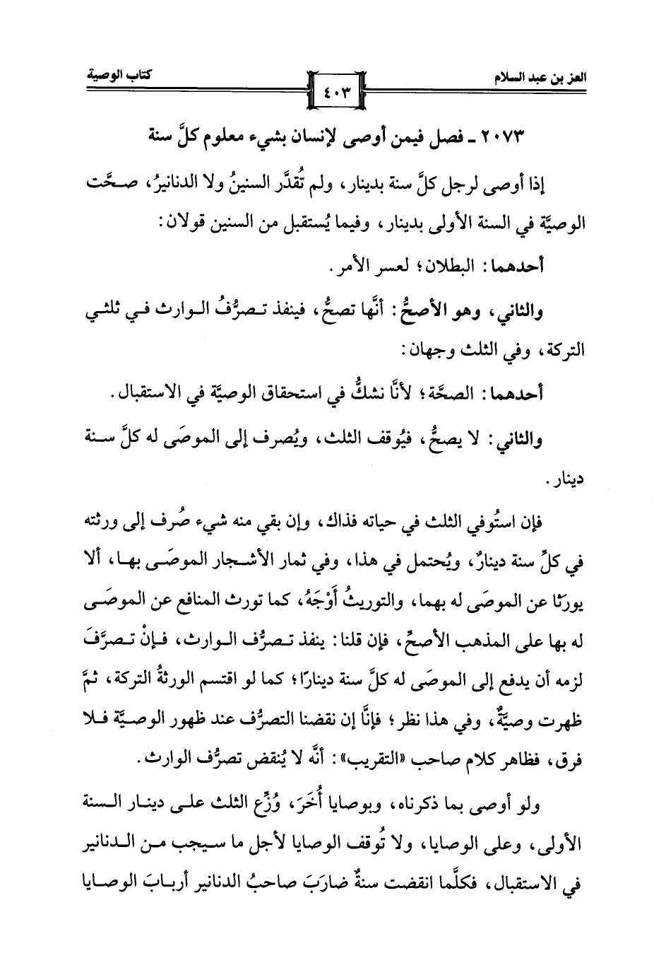 2073 - فصل فيمن أوصى لإنسان بشيء معلوم كلَّ سنة