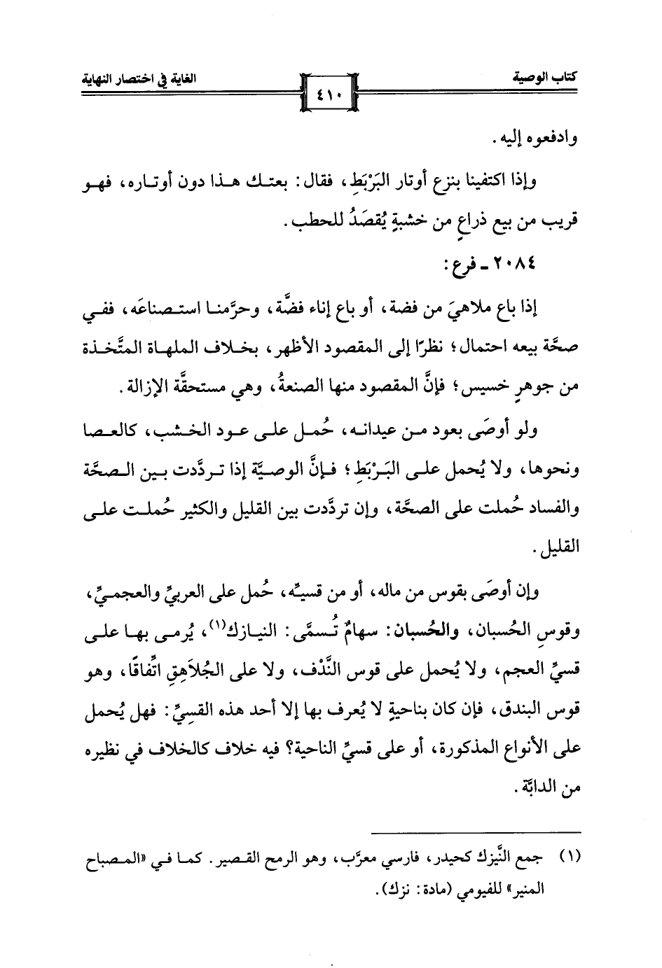 وإن أوصَى بقوس من ماله، أو من قسيِّه، حُمل على العربيِّ والعجميِّ، وقوسِ الحُسبان، والحُسبان: سهامٌ تُسمَّى: النيازك (¬1)، يُرمى بها على قسيِّ المعجم، ولا يُحمل على قوس النَّدْف، ولا على الجُلَاهِقِ اتِّفاقًا، وهو قوس البندق، فإن كان بناحيةٍ لا يُعرف بها إلا أحد هذه القسِيِّ: فهل يُحمل على الأنواع المذكورة، أو على قسيِّ الناحية؟ فيه خلاف كالخلاف في نظيره من الدابَّة.
