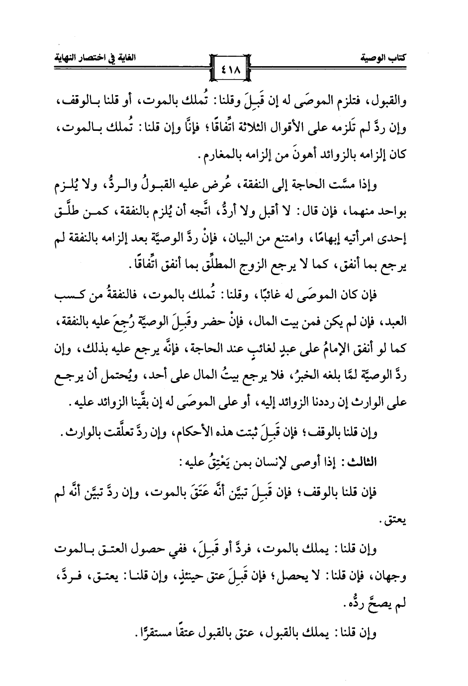 وإذا مسَّت الحاجة إلى النفقة، عُرض عليه القبولُ والردُّ، ولا يُلزم بواحد منهما، فإن قال: لا أقبل ولا أردُّ، اتَّجه أن يُلزم بالنفقة، كمن طلَّق إحدى امرأتيه إبهامًا، وامتنع من البيان، فإنْ ردَّ الوصيَّة بعد إلزامه بالنفقة لم يرجع بما أنفق، كما لا يرجع الزوج المطلِّق بما أنفق اتِّفاقًا.