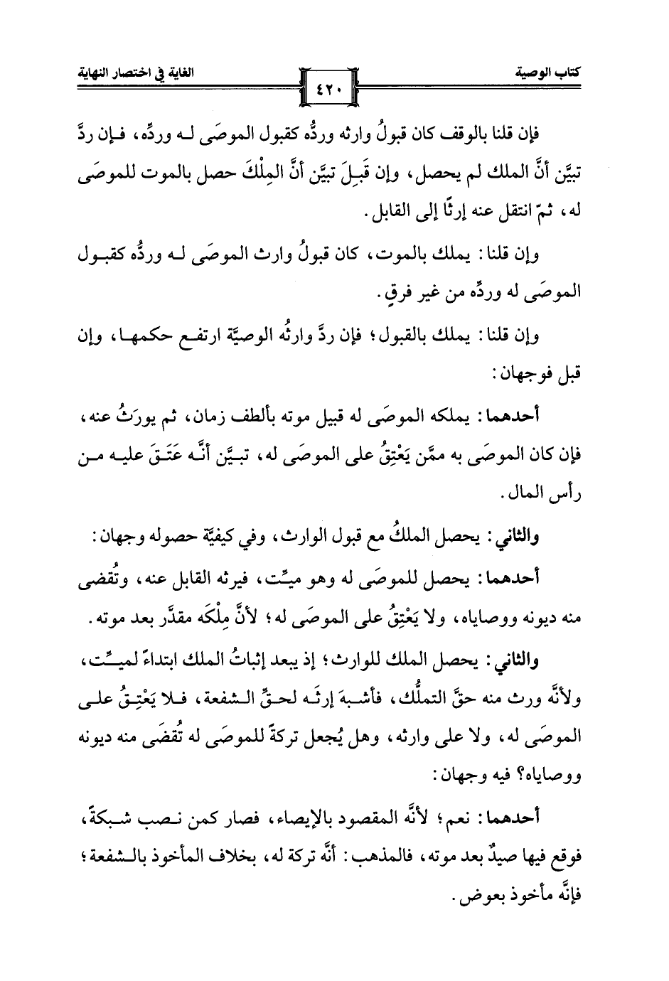 والثاني: يحصل الملك للوارث؛ إذ يبعد إثباتُ الملك ابتداء لميِّت، ولأنَّه ورث منه حقَّ التملُّك، فأشبهَ إرثَه لحقِّ الشفعة، فلا يَعْتِقُ على الموصَى له، ولا على وارثه، وهل يُجعل تركة للموصَى له تُقضَى منه ديونه ووصاياه؛ فيه وجهان: