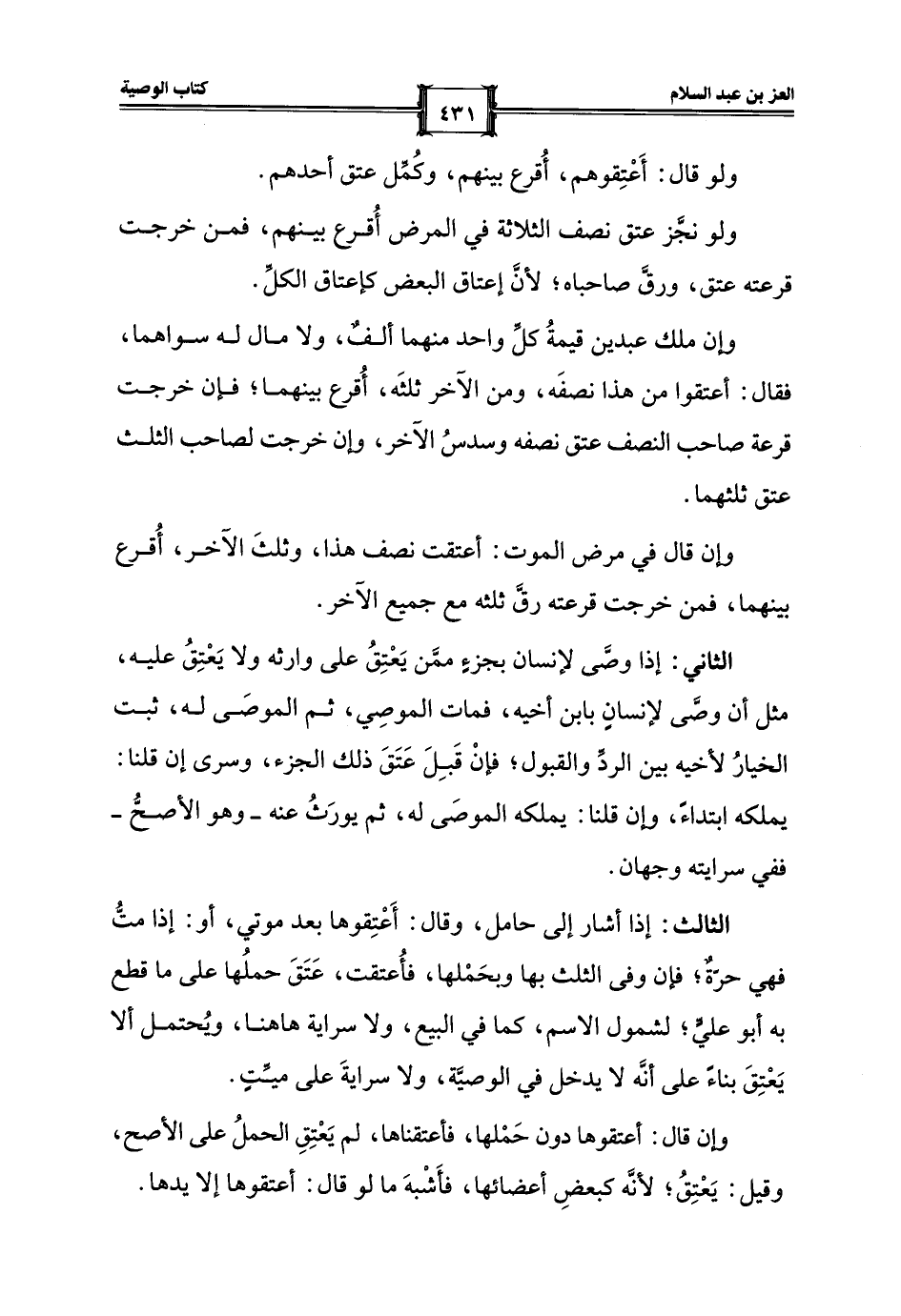 وإن ملك عبدين قيمةُ كلِّ واحد منهما ألفٌ، ولا مال له سواهما، فقال: أعتقوا من هذا نصفَه، ومن الآخر ثلثَه، أُقرع بينهما؛ فإن خرجت قرعة صاحب النصف عتق نصفه وسدسُ الآخر، وإن خرجت لصاحب الثلث عتق ثلثهما.
