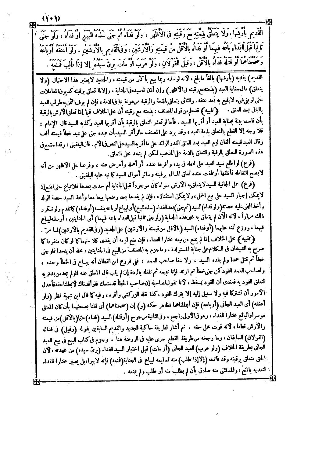 فرع حمل الجانية للسيد لا يتعلق به الأرش سواء كان موجودا قبل الجناية أم حدث بعدها فلا تباع حتى تضع إذ لا يمكن إجبار السيد على بيع الحمل ولا يمكن استثناؤه فإن لم يفدها بعد وضعها بيعا معا وأخذ السيد حصة الولد وأخذ المجني عليه حصته ( ولو فداه ) السيد ( ثم جنى ) بعد الفداء ( سلمه للبيع ) أي ليباع أو باعه بنفسه ( أو فداه ) كما تقدم ولو تكرر ذلك مرارا لأنه الآن لم يتعلق به غير هذه الجناية ( ولو جنى ثانيا قبل الفداء باعه فيهما ) أي الجنايتين أو سلمه ليباع فيهما ووزع ثمنه عليهما ( أو فداه ) السيد ( بالأقل من قيمته والأرشين ) على الجديد ( وفي القديم بالأرشين ) لما مر
