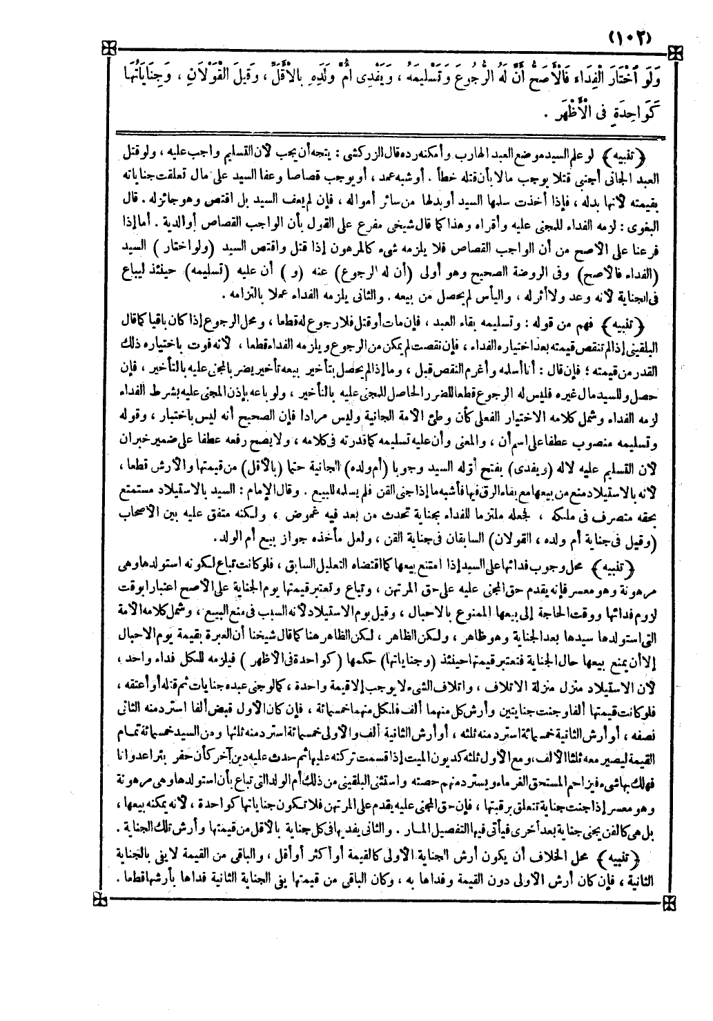 تنبيه فهم من قوله وتسليمه بقاء العبد فإن مات أو قتل فلا رجوع له قطعا ومحل الرجوع إذا كان باقيا كما قال البلقيني إذا لم تنقص قيمته بعد اختياره الفداء فإن نقصت لم يمكن من الرجوع ويلزمه الفداء قطعا لأنه فوت باختياره ذلك القدر من قيمته فإن قال أنا أسلمه وأغرم النقص قبل وما إذا لم يحصل بتأخير بيعه تأخير يضر بالمجني عليه بالتأخير فإن حصل وللسيد مال غيره فليس له الرجوع قطعا للضرر الحاصل للمجني عليه بالتأخير ولو باعه بإذن المجني عليه بشرط الفداء لزمه الفداء وشمل كلامه الاختيار الفعلي كأن وطىء الأمة الجانية وليس مرادا فإن الصحيح أنه ليس باختبار وقوله وتسليمه منصوب عطفا على اسم أن والمعنى وأن عليه تسليمه كما قدرته في كلامه ولا يصح رفعه عطفا على ضمير خبر أن لأن التسليم عليه لا له
