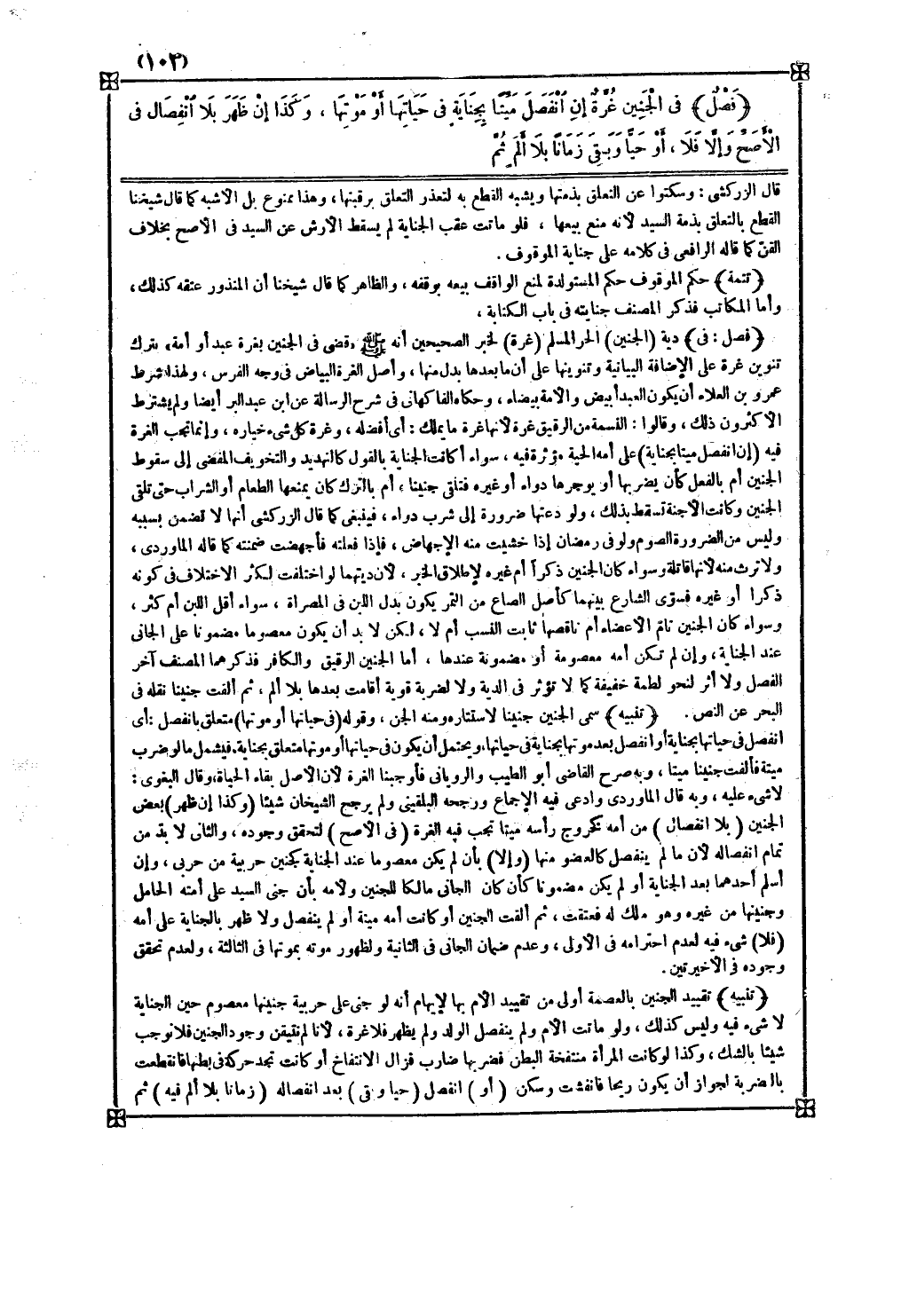 فصل في دية ( الجنين ) الحر المسلم ( غرة ) لخبر الصحيحين أنه صلى الله عليه وسلم قضى في الجنين بغرة عبد أو أمة بترك تنوين غرة على الإضافة البيانية وتنوينها على أن ما بعدها بدل منها وأصل الغرة البياض في وجه الفرس ولهذا شرط عمرو بن العلاء أن يكون العبد أبيض والأمة بيضاء وحكاه الفاكهاني في شرح الرسالة عن ابن عبد البر أيضا ولم يشترط الأكثرون ذلك وقالوا النسمة من الرقيق غرة لأنها غرة ما يملك أي أفضله وغرة كل شيء خياره وإنما تجب الغرة فيه ( إن انفصل ميتا بجناية ) على أمه الحية مؤثرة فيه سواء أكانت الجناية بالقول كالتهديد والتخويف المفضي إلى سقوط الجنين أم بالفعل كأن يضربها أو يوجرها دواء أو غيره فتلقي جنينا أم بالترك كأن يمنعها الطعام أو الشراب حتى تلقي الجنين وكانت الأجنة تسقط بذلك ولو دعتها ضرورة إلى شرب دواء فينبغي كما قال الزركشي أنها لا تضمن بسببه وليس من الضرورة الصوم ولو في رمضان إذا خشيت منه الإجهاض فإذا فعلته فأجهضت ضمنته كما قاله الماوردي ولا ترث منه لأنها قاتلة وسواء كان الجنين ذكرا أم غيره لإطلاق الخبر لأن ديتهما لو اختلفت لكثر الاختلاف في كونه ذكرا أو غيره فسوى الشارع بينهما كأصل الصاع من التمر يكون بدل اللبن في المصراة سواء أقل اللبن أم كثر وسواء كان الجنين تام الأعضاء أم ناقصها ثابت النسب أم لا لكن لا بد أن يكون معصوما مضمونا على الجاني عند الجناية وإن لم تكن أمه معصومة أو مضمونة عندها أما الجنين الرقيق والكافر فذكرهما المصنف آخر الفصل ولا أثر لنحو لطمة خفيفة كما لا تؤثر في الدية ولا لضربة قوية أقامت بعدها بلا ألم ثم ألقت جنينا نقله في البحر عن النص