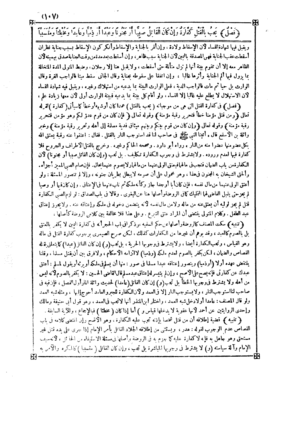 تنبيه سكت المصنف كالروضة وأصلها عن حكم السفيه وذكرا في باب الحجر أنه في كفارة اليمين لا يكفر بالعتق بل بالصوم كالعبد وقد يوهم أن غيرها من الكفارات كذلك لكن صرح الصيمري بوجوب كفارة القتل في ماله وهو القياس وتجب الكفارة أيضا ولا يشترط في وجوبها الحرية بل تجب ( و ) إن كان القاتل ( عبدا ) كما يتعلق بقتله القصاص والضمان لكن يكفر بالصوم لعدم ملكه ( وذميا ) لالتزامه الأحكام ولا فرق بين أن يقتل مسلما وقلنا ينتقض عهده أولا ( أو ذميا ) ويتصور إعتاقه عبدا مسلما في صور منها أن يسلم في ملكه أو يرثه أو يقول لمسلم أعتق عبدك عن كفارتي فإنه يصح على الأصح وإن لم يتيسر له إعتاق عبد مسلم قال القاضي الحسين لا يكفر بالصوم لأنه ليس من أهله ولا يشترط في وجوبها الخطأ بل تجب ( و ) إن كان القاتل ( عامدا ) لحديث وائلة المار أول الفصل فإن فيه في صاحب لنا استوجب النار ولا يستوجب النار إلا في العمد ولأن الكفارة للجبر والعامد أحوج إليها ومثله شبه العمد ولو قال المصنف عامدا أو لا دخل شبه العمد واختار ابن المنذر أنها لا تجب في العمد