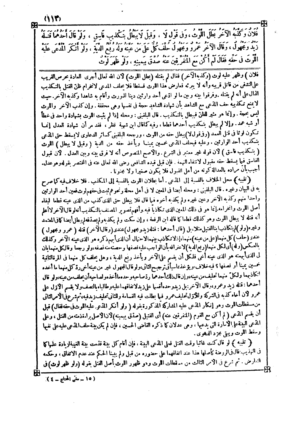 قال البلقيني ومحله أيضا في المعين لا في أهل محلة ونحوهم ثبت في حقهم لوث فعين أحد الوارثين واحدا منهم وكذبه الآخر وعين غيره ولم يكذبه أخوه فيما قال فلا يبطل حق الذي كذب من الذي عينه قطعا لبقاء أصل اللوث وانخرامه إنما هو في ذلك المعين الذي تكاذبا فيه