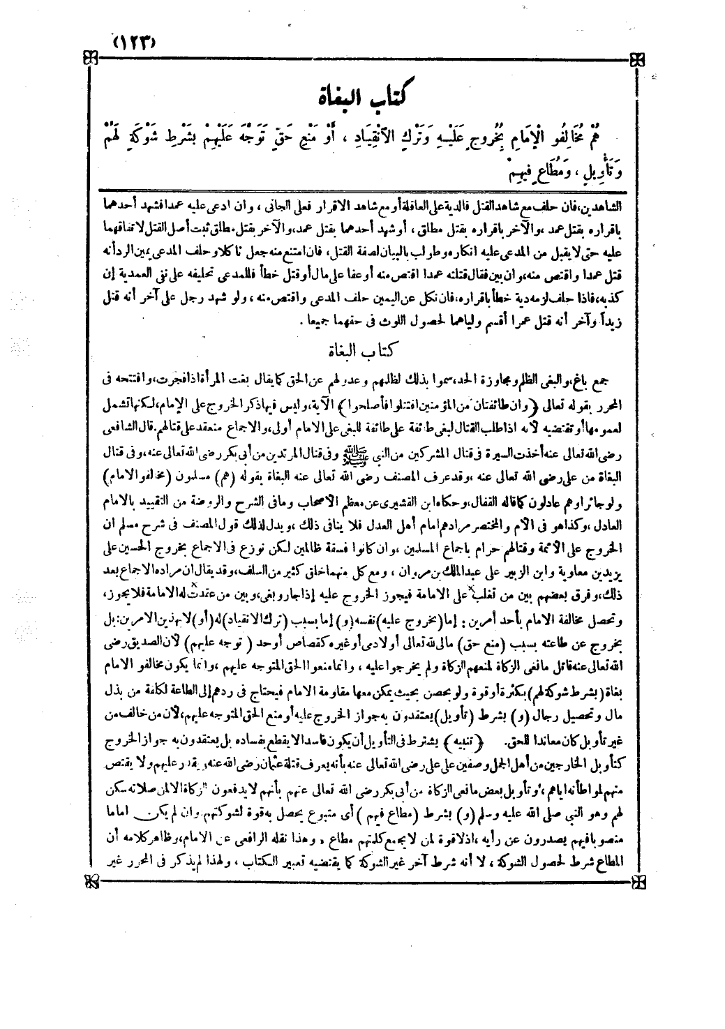 كتاب البغاة جمع باغ والبغي الظلم ومجاوزة الحد سموا بذلك لظلمهم وعدولهم عن الحق كما يقال بغت المرأة إذا فجرت وافتتحه في المحرر بقوله تعالى { وإن طائفتان من المؤمنين اقتتلوا فأصلحوا } الآية وليس فيها ذكر الخروج على الإمام لكنها تشمل لعمومها أو تقتضيه لأنه إذا طلب القتال لبغي طائفة على طائفة للبغي على الإمام أولى والإجماع منعقد على قتالهم