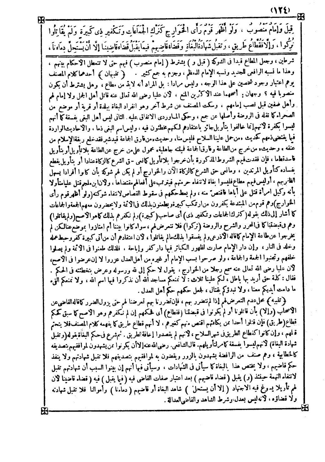 شرطين وجعل المطاع قيدا في الشوكة ( قيل و ) يشترط ( إمام منصوب ) فيهم حتى لا تتعطل الأحكام بينهم وهذا ما نسبه الرافعي للجديد ونسبه الإمام للمعظم وجزم به جمع كثير
