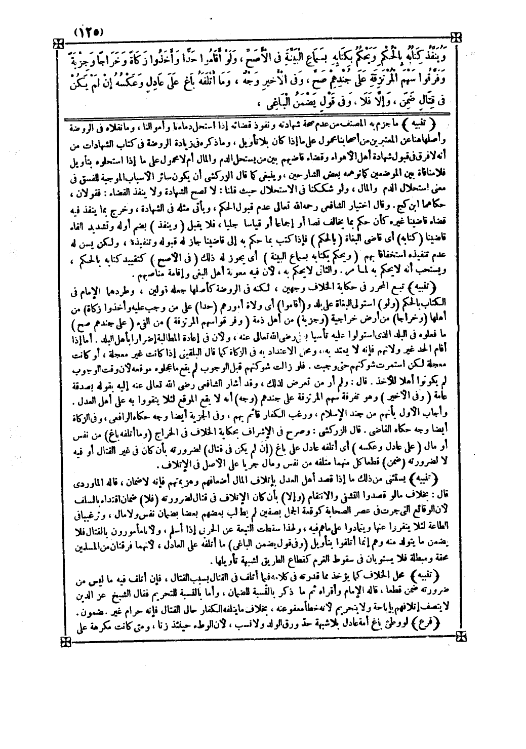 قال الزركشي وصرح في الإشراف بحكاية الخلاف في الخراج (وما أتلفه باغ) من نفس أو مال (على عادل وعكسه) أي أتلفه عادل على باغ (إن لم يكن في قتال) لضرورته بأن كان في غير القتال أو فيه لا لضرورته (ضمن) قطعا كل منهما متلفه من نفس ومال جريا على الأصل في الإتلاف