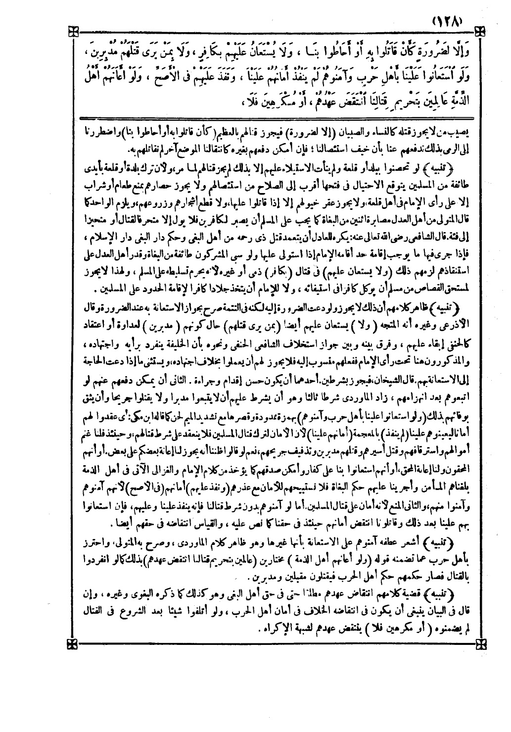 تنبيه ظاهر كلامهم أن ذلك لا يجوز ولو دعت الضرورة إليه لكنه في التتمة صرح بجواز الاستعانة به عند الضرورة وقال الأذرعي وغيره أنه المتجه ( ولا ) يستعان عليهم أيضا ( بمن يرى قتلهم ) حال كونهم ( مدبرين ) لعداوة أو اعتقاد ك الحنفي إبقاء عليهم وفرق بينه وبين جواز استخلاف الشافعي الحنفي ونحوه بأن الخليفة ينفرد برأيه واجتهاده والمذكورون هنا تحت رأي الإمام ففعلهم منسوب إليه فلا يجوز لهم أن يعملوا بخلاف اجتهاده ويستثنى ما إذا دعت الحاجة إلى الاستعانة بهم