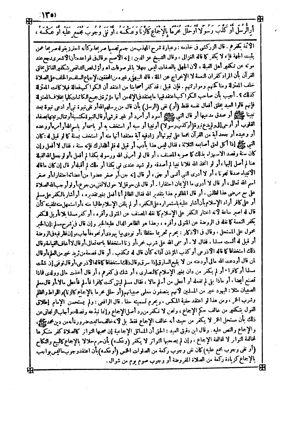( أو ) نفى ( الرسل ) بأن قال من يرسلهم الله أو نفى نبوة نبي أو ادعى نبوة بعد نبينا صلى الله عليه وسلم أو صدق مدعيها أو قال النبي صلى الله عليه وسلم أسود أو أمرد أو غير قرشي أو قال النبوة مكتسبة أو تنال رتبتها بصفاء القلوب أو أوحى إلي ولم يدع نبوة ( أو كذب رسولا ) أو نبيا أو سبه أو استخف به أو باسمه أو باسم الله أو أمره أو وعده أو وعيده أو جحد آية من القرآن مجمعا على ثبوتها أو زاد فيه آية معتقدا أنها منه أو استخف بسنة كما لو قيل له كان النبي صلى الله عليه وسلم إذا أكل لعق أصابعه الثلاثة فقال ليس هذا بأدب أو قيل له قلم أظفارك فإنه سنة فقال لا أفعل وإن كان سنة وقصد الاستهزاء بذلك كما صوبه المصنف أو قال لو أمرني الله ورسوله بكذا لم أفعل أو لو جعل الله القبلة هنا لم أصل إليها أو لو اتخذ الله فلانا نبيا لم أصدقه ولو شهد عندي نبي بكذا أو ملك لم أقبله أو قال إن كان ما قاله الأنبياء صدقا نجونا أو لا أدري النبي أنسي أو جني أو قال إنه جن أو صغر عضوا من أعضائه احتقارا أو صغر اسم الله تعالى أو قال لا أدري ما الإيمان احتقارا أو قال لمن حوقل لا حول لا تغني من جوع أو لو أوجب الله الصلاة على مع مرضي هذا لظلمني أو قال المظلوم هذا بتقدير الله فقال الظالم أنا أفعل بغير تقديره أو أشار بالكفر على مسلم أو على كافر أراد الإسلام بأن أشار عليه باستمراره على الكفر أو لم يلقن الإسلام طالبا منه أو استمهل منه تلقينه كأن قال له اصبر ساعة لأنه اختار الكفر على الإسلام كما نقله المصنف عن المتولي وأقره أو كفر مسلما بلا تأويل للكفر بكفر النعمة كما نقله في الروضة عن المتولي وأقره وهذا هو الظاهر الدال عليه الخبر وإن قال في شرح مسلم إن الخبر محمول على المستحل وقال في الأذكار يحرم تحريما مغلظا أو نودي بيا يهودي أو نحوه فأجاب وإن نظر فيه في الروضة أو قيله له ألست مسلما فقال لا أو سمى الله على شرب خمر أو زنا استخفافا باسمه تعالى أو قال لا أخاف القيامة وقال ذلك استخفافا كما قاله الأذرعي أو كذب المؤذن آذانه كأن قال له تكذب أو قال قصعة من ثريد خير من العلم أو قال لمن قال أودعت الله مالي أودعته من لا يتبع السارق إذا سرق وقال ذلك استخفافا كما قاله الأذرعي أو قال توفني إن شئت مسلما أو كافرا أو لم يكفر من دان بغير الإسلام كالنصارى أو شك في كفرهم أو قال أخذت مالي وولدي فماذا تصنع أيضا أو ماذا بقي لم تفعله أو أعطى من أسلم مالا فقال مسلم ليتني كنت كافرا فأسلم فأعطى مالا أو قال معلم الصبيان مثلا اليهود خير من المسلمين لأنهم ينصفون معلمي صبيانهم ( أو حلل محرما بالإجماع كالزنا ) واللواط والظلم وشرب الخمر ومن هذا لو اعتقد حقية المكس ويحرم تسميته حقا