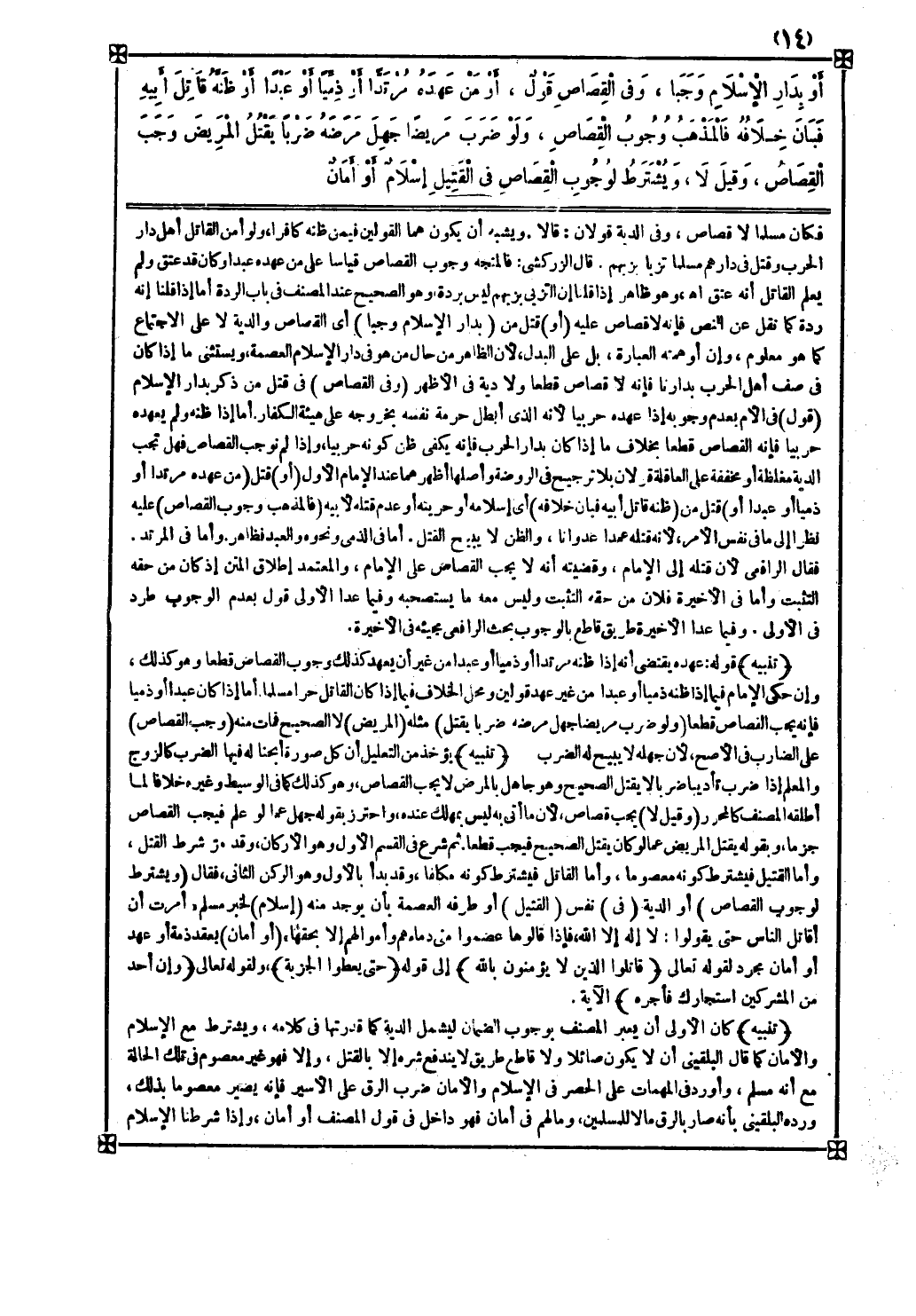 ثم شرع في القسم الأول وهو الأركان وقد مر شرط القتل وأما القتيل فيشترط كونه معصوما وأما القاتل فيشترط كونه مكلفا وقد بدأ بالأول وهو الركن الثاني فقال ( ويشترط لوجوب القصاص ) أو الدية ( في ) نفس ( القتيل ) أو طرفه العصمة بأن يوجد منه ( إسلام ) لخبر مسلم أمرت أن أقاتل الناس حتى يقولوا لا إله إلا الله فإذا قالوها عصموا مني دماءهم وأموالهم إلا بحقها