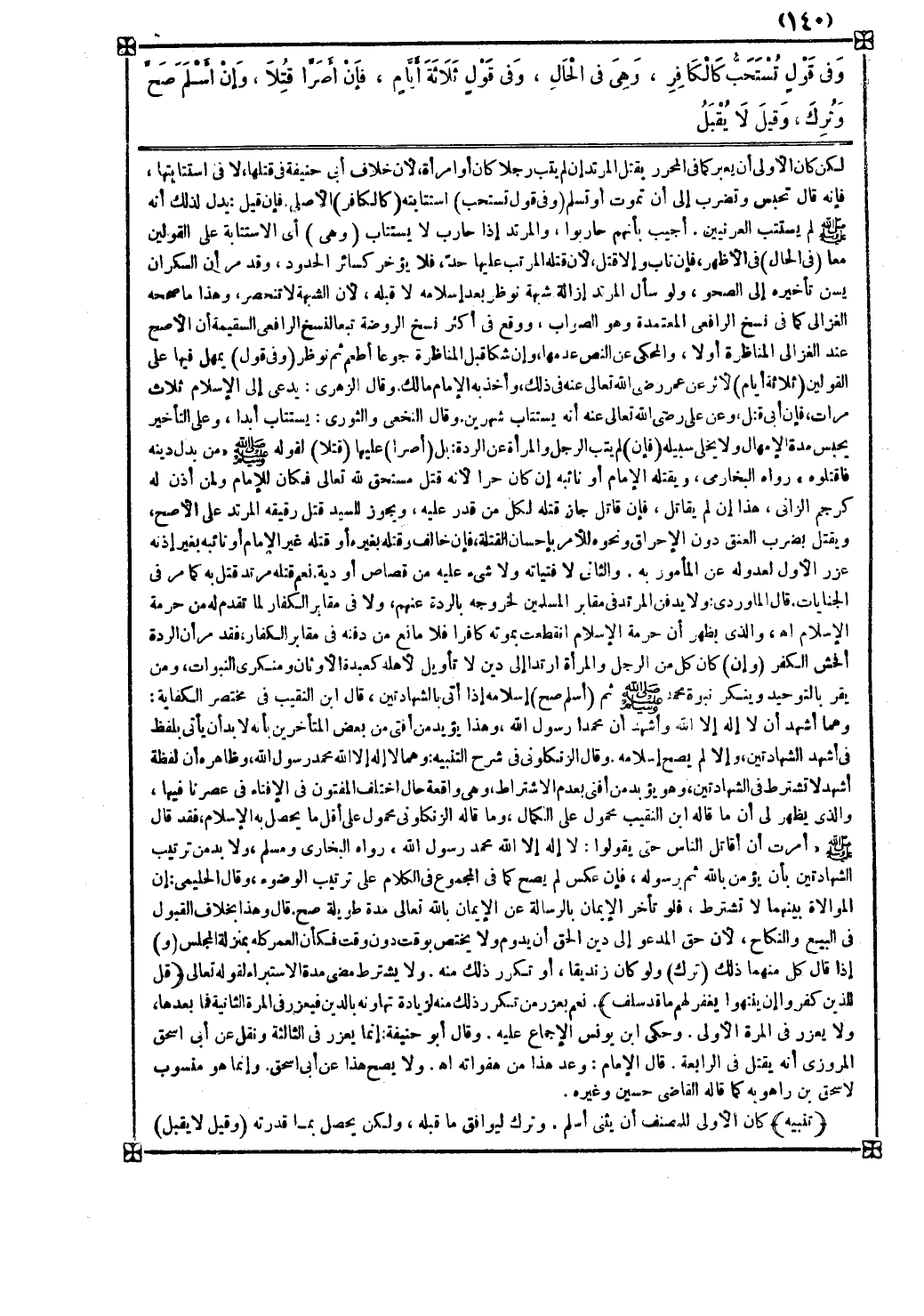 ( فإن ) لم يتب الرجل والمرأة عن الردة بل ( أصرا ) عليها ( قتلا ) لقوله صلى الله عليه وسلم من بدل دينه فاقتلوه رواه البخاري ويقتله الإمام أو نائبه إن كان حرا لأنه قتل مستحق لله تعالى فكان للإمام ولمن أذن له كرجم الزاني هذا إن لم يقاتل فإن قاتل جاز قتله لكل من قدر عليه ويجوز للسد فتل رقيقه المرتد على الأصح ويقتل بضرب العنق دون الإحراق ونحوه للأمر بإحسان القتلة فإن خالف وقتله بغيره أو قتله غير الإمام أو نائبه بغير إذنه عزر الأول لعدوله عن المأمور به
