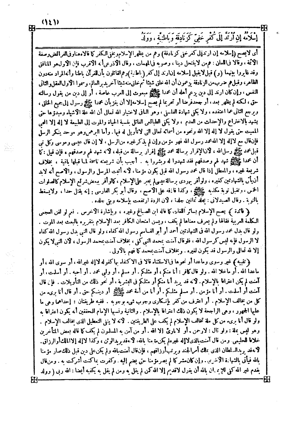 أي لا يصح ( إسلامه إن ارتد إلى كفر خفي كزنادقة ) وهم من يظهر الإسلام وبخفى الكفر كما قالاه هنا وفي الفرائض وصفة الأئمة وقالا في اللعان هم من لا ينتحل دينا وصوبه في المهمات وقال الأذرعي أنه الأقرب فإن الأول هو المنافق وقد غايروا بينهما ( و ) قيل لا يقبل إسلامه إن ارتد إلى كفر ( باطنية ) وهم القائلون بأن للقرآن باطنا وأنه المراد منه دون الظاهر وقيل هم ضرب من الزنادقة يزعمون أن الله خلق شيئا ثم خلق منه شيئا آخر يدبر العالم وسموا الأول العقل والثاني النفس وإن كان ارتد إلى دين يزعم أهله أن محمدا صلى الله عليه وسلم مبعوث إلى العرب خاصة أو إلى دين من يقول رسالته حق لكنه لم يظهر بعد أو جحد فرضا أو تحريما لم يصح إسلامه إلا أن يقر بأن محمدا صلى الله عليه وسلم رسول إلى جميع الخلق ويرجع الثاني عما اعتقده ولا يكفي شهادة الفلسفي وهو النافي لاختيار الله تعالى أن الله علة الأشياء ومبدؤها حتى يشهد بالاختراع والإحداث من العدم ولا يكفي الطبائعي القائل بنسبة الحياة والموت إلى الطبيعة لا إله إلا المحيي المميت حتى يقول لا إله إلا الله ونحوه من أسمائه تعالى التي لا تأويل له فيها