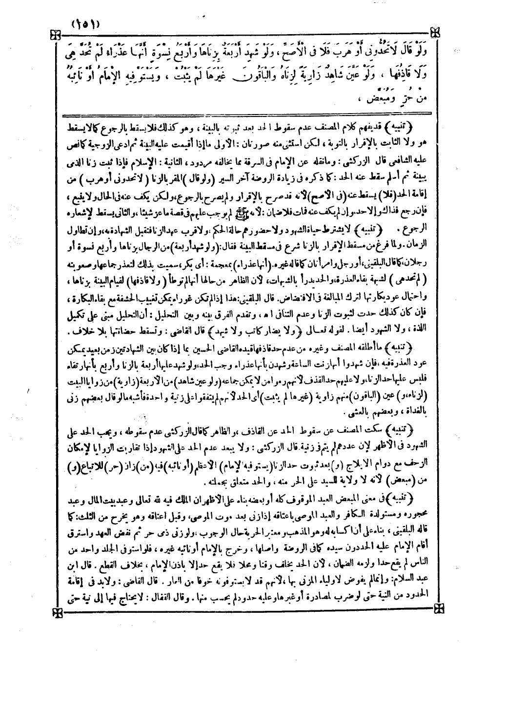 تنبيه في معنى المبعض العبد الموقوف كله أو بعضه بناء على الأظهر أن الملك فيه لله تعالى وعبد بيت المال وعبد محجوره ومستولدة الكافر والعبد الموصى بإعتاقه إذا زنى بعد موت الموصى وقبل إعتاقه وهو يخرج من الثلث كما قاله البلقيني بناء على أن إكسابه له وهو المذهب ومعتبر الحرية حال الوجوب ولو زنى ذمي حر ثم نفض العهد واسترق أقام الإمام عليه الحد دون سيده كما في الروضة وأصلها وخرج بالإمام أو نائبه غيره فلو استوفى الجلد واحد من الناس لم يقع حدا ولزمه الضمان لأن الحد يخلف وقتا ومحلا فلا يقع حد إلا بإذن الإمام بخلاف القطع
