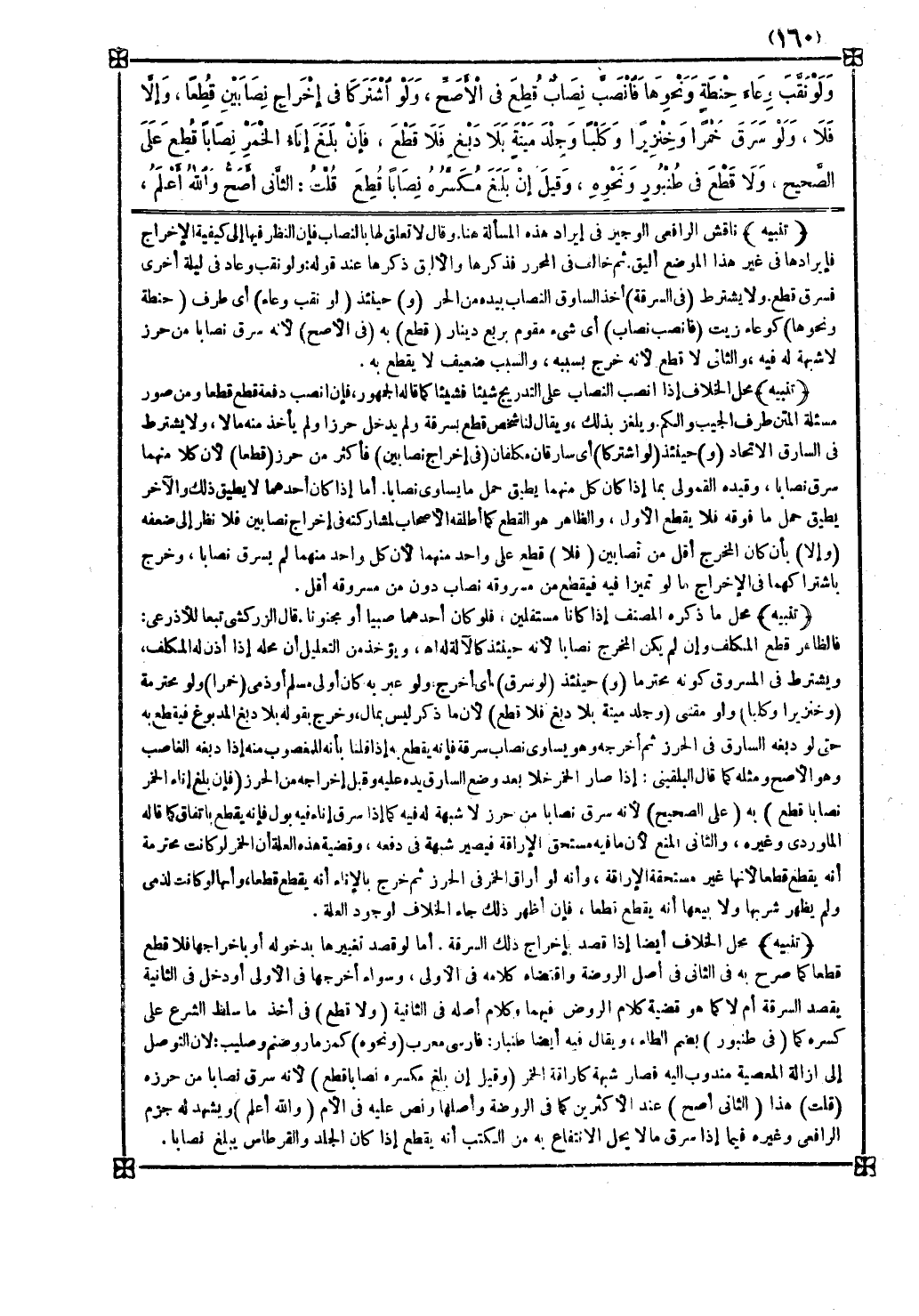 تنبيه محل الخلاف أيضا إذا قصد بإخراج ذلك السرقة أما لو قصد تغييرها بدخوله أو بإخراجها فلا قطع قطعا كما صرح به في الثاني في أصل الروضة واقتضاه كلامه في الأولى وسواء أخرجها في الأولى أو دخل في الثانية يقصد السرقة أم لا كما هو قضية كلام الروض فيهما وكلام أصله في الثانية ( ولا قطع ) في أخذ ما سلط الشرع على كسره كما ( في طنبور ) بضم الطاء ويقال فيه أيضا طنبار فارسي معرب ( ونحوه ) كمزمار وصنم وصليب لأن التوصل إلى إزالة المعصية مندوب إليه فصار شبهة كإراقة الخمر ( وقيل إن بلغ مكسره نصابا قطع ) لأنه سرق نصابا من حرزه ( قلت ) هذا ( الثاني أصح ) عند الأكثرين كما في الروضة وأصلها ونص عليه في الأم ( والله أعلم ) ويشهد له جزم الرافعي وغيره فيما إذا سرق ما لا يحل الانتفاع به من الكتب أنه يقطع إذا كان الجلد والقرطاس يبلغ نصابا
