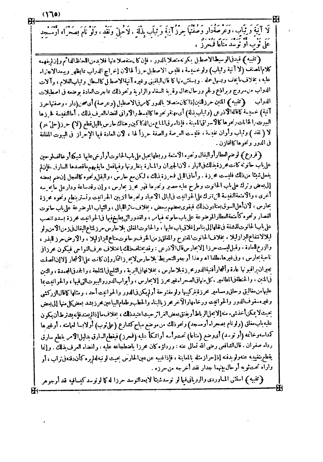 وأما في الليل فمحرزة بذلك لكن مع حارس والبقل ونحوه كالفجل إن ضم بعضه إلى بعض وترك على باب الحانوت وطرح عليه حصير ونحوها فهو محرز بحارس وإن رقد ساعة ودار على ما يحرسه أخرى والأمتعة النفيسة التي تترك على الحوانيت في ليالي الأعياد ونحوها لتزيين الحوانيت وتستر بنطع ونحوه محرزة بحارس لأن أهل السوق يعتادون ذلك فيقوى بعضهم ببعض بخلاف سائر الليالي والثياب الموضوعة على باب حانوت القصار ونحوه كأمتعة العطار الموضوعة على باب حانوته فيما مر والقدور التي يطبخ فيها في الحوانيت محرزة بسدد تنصب على باب الحانوت للمشقة في نقلها إلى بناء وإغلاق باب عليها والحانوت المغلق بلا حارس حرز لمتاع البقال في زمن الأمن ولو ليلا لانتفاع البزاز ليلا بخلاف الحانوت المفتوح والمغلق زمن الخوف وحانوت متاع البزاز ليلا والأرض حرز للبذر والزرع للعادة وقيل ليست حرزا إلا بحارس