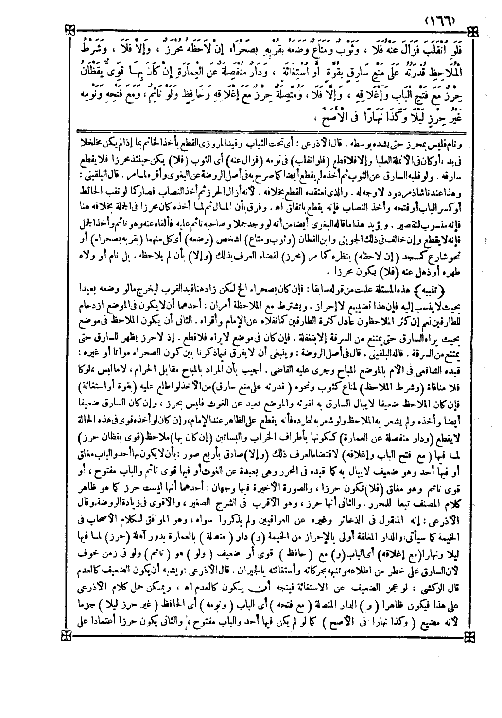 وقال الأذرعي إنه المنقول في الذخائر وغيره عن العراقيين ولم يذكروا سواه وهو الموافق لكلام الأصحاب في الخيمة كما سيأتي والدار المغلقة أولى بالإحراز من الخيمة ( و ) دار ( متصلة ) بالعمارة بدور آهلة ( حرز ) لما فيها ليلا ونهارا ( مع إغلاقه ) أي الباب ( و ) مع ( حافظ ) قوي أو ضعيف ( ولو ) هو ( نائم ) ولو في زمن خوف لأن السارق على خطر من اطلاعه وتنبهه بحركاته واستغاثته بالجيران