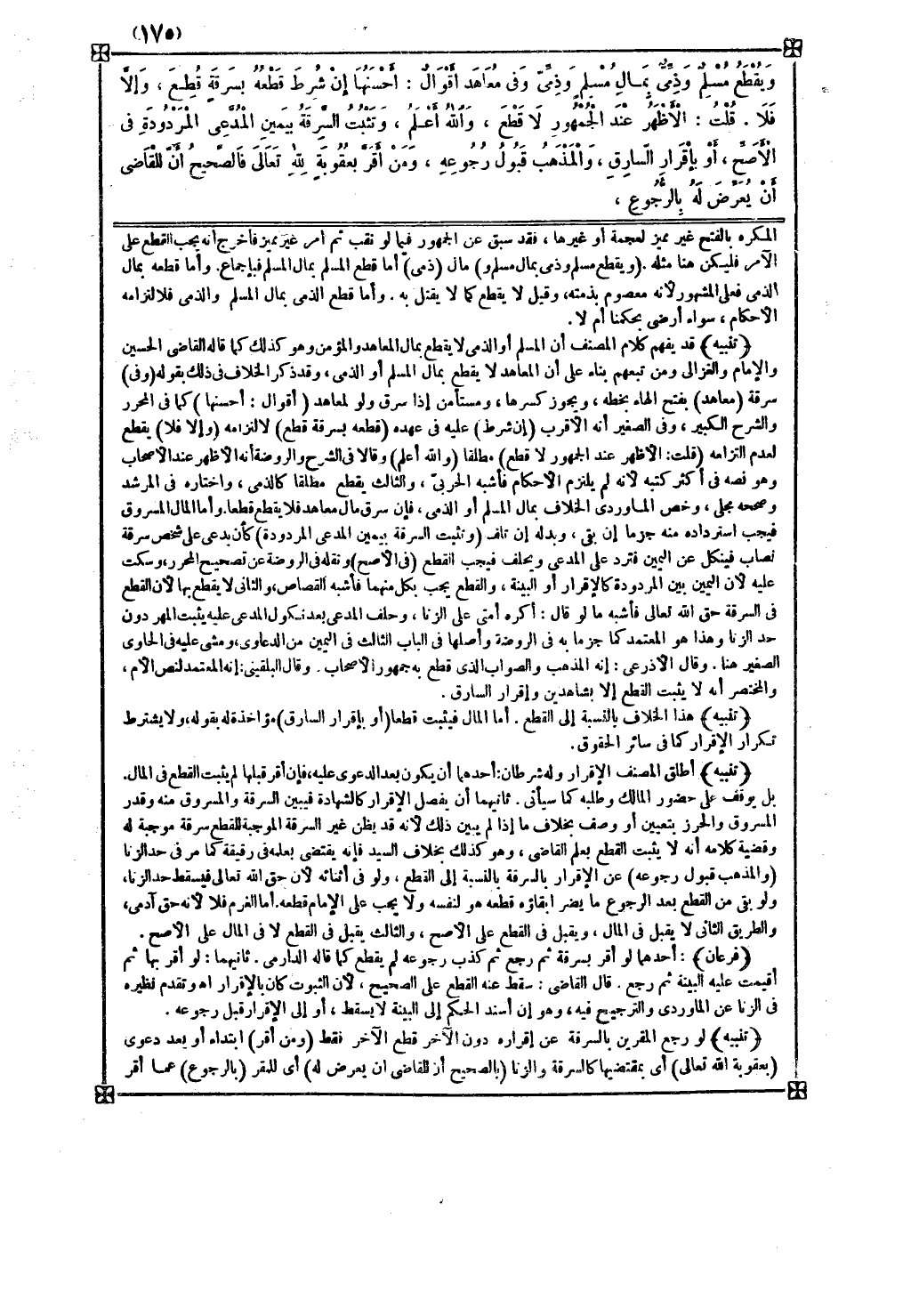 ( والمذهب قبول رجوعه ) عن الإقرار بالسرقة بالنسبة إلى القطع ولو في أثنائه لأن حق الله تعالى فيسقط حد الزنا ولو بقي من القطع بعد الرجوع ما يضر إبقاؤه قطعه هو لنفسه ولا يجب على الإمام قطعه أما الغرم فلا لأنه حق آدمي والطريق الثاني لا يقبل في المال ويقبل في القطع على الأصح والثالث يقبل في القطع لا في المال على الأصح