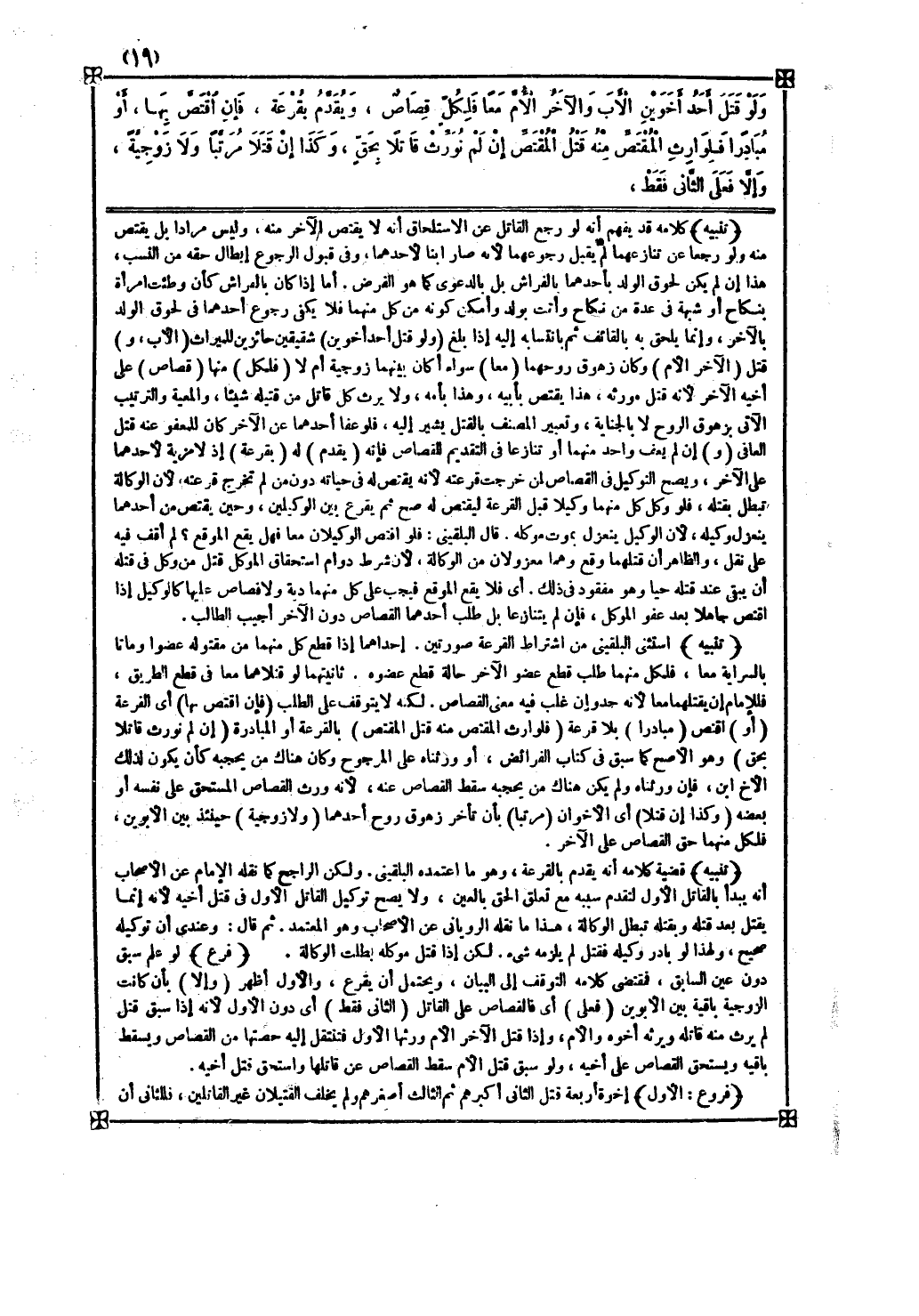 ( ولو قتل أحد أخوين ) شقيقين حائزين للميراث ( الأب و ) قتل ( الآخر الأم ) وكان زهوق روحهما ( معا ) سواء أكان بينهما زوجية أم لا ( فلكل ) منهما ( قصاص ) على أخيه الآخر لأنه قتل مورثه هذا يقتص بأبيه وهذا بأمه ولا يرث كل قاتل من قتيله شيئا والمعية والترتيب الآتي بزهوق الروح لا بالجناية وتعبير المصنف بالقتل يشير إليه فلو عفا أحدهما عن الآخر كان للمعفو عنه قتل العافي ( و ) إن لم يعف واحد منهما أو تنازعا في التقديم للقصاص فإنه ( يقدم ) له ( بقرعة ) إذ لا مزية لأحدهما على الآخر ويصح التوكيل في القصاص لمن خرجت قرعته لأنه يقتص له في حياته دون من لم تخرج قرعته لأن الوكالة تبطل بقتله فلو وكل كل منهما وكيلا قبل القرعة ليقتص له صح ثم يقرع بين الوكيلين وحين يقتص من أحدهما ينعزل وكيله لأن الوكيل ينعزل بموت موكله