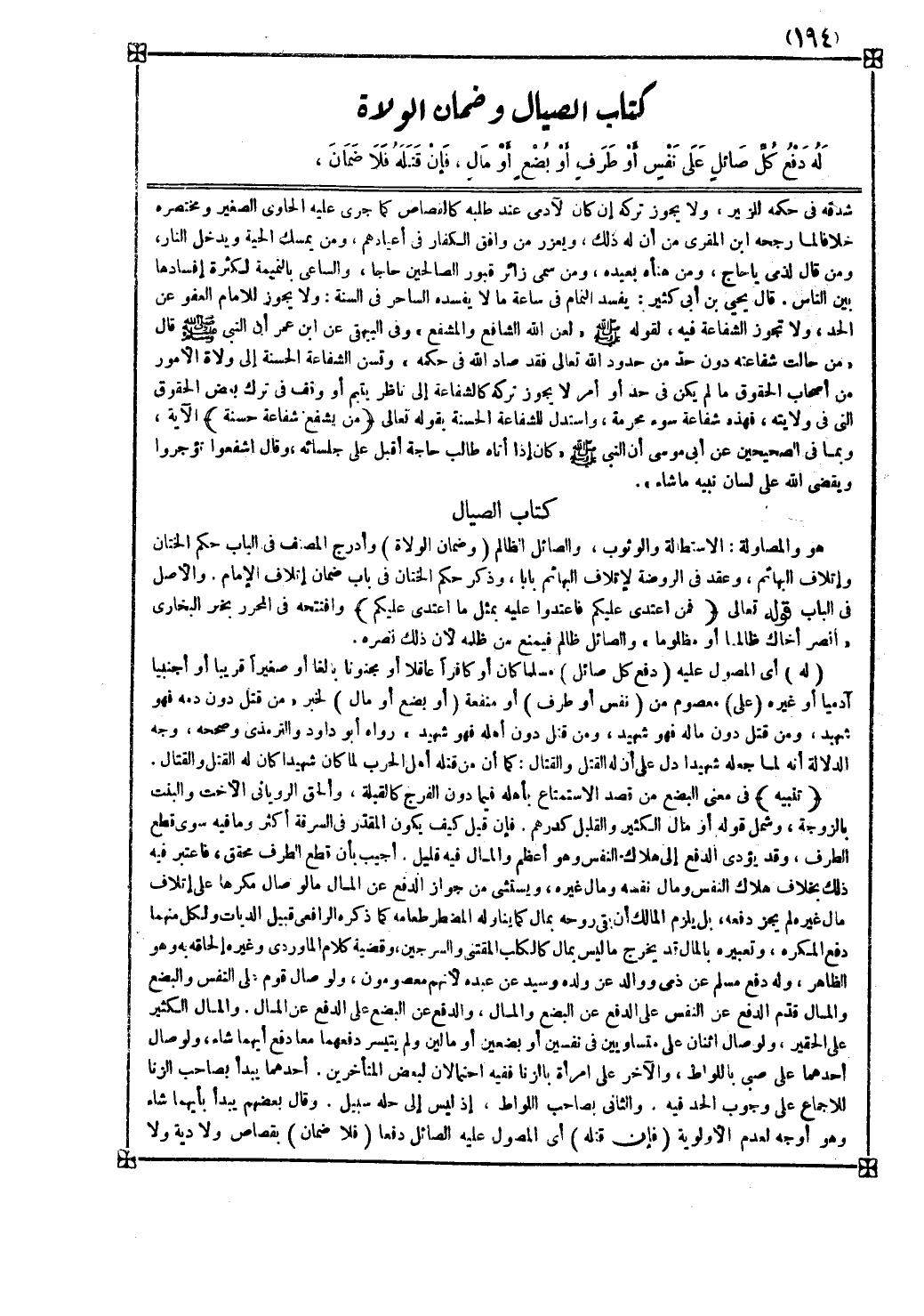 كتاب الصيال هو والمصاولة الاستطالة والوثوب والصائل الظالم ( وضمان الولاة ) وأدرج المصنف في الباب حكم الختان وإتلاف البهائم وعقد في الروضة لإتلاف البهائم بابا وذكر حكم الختان في باب ضمان إتلاف الإمام