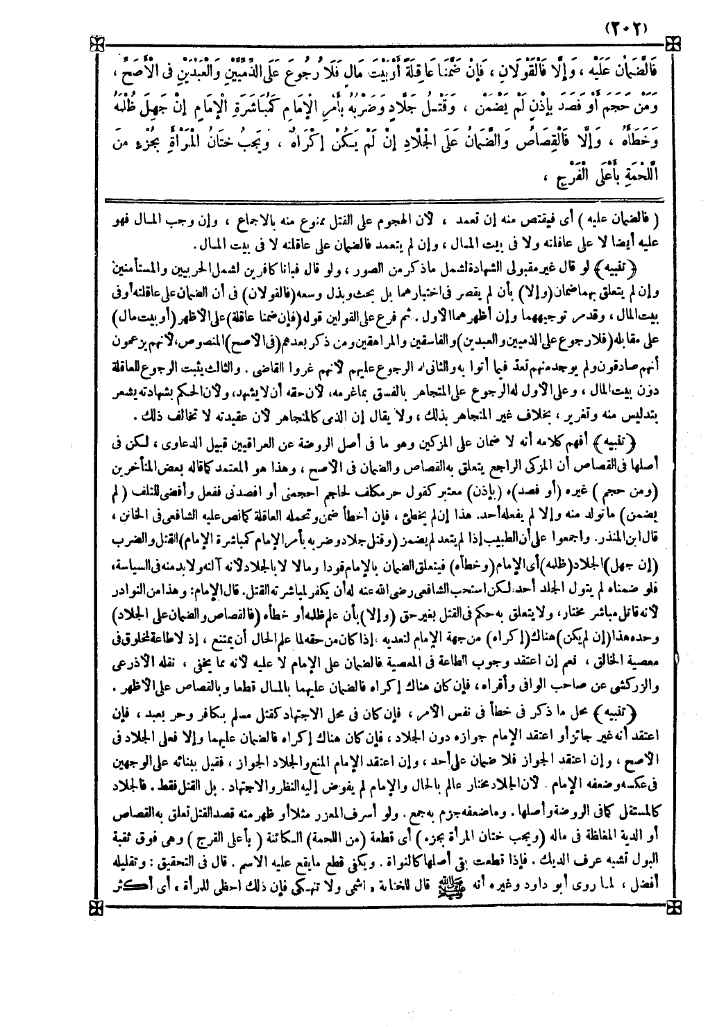 تنبيه محل ما ذكر في خطأ في نفس الأمر فإن كان في محل الاجتهاد كقتل مسلم بكافر وحر بعبد فإن اعتقد أنه غير جائز أو اعتقد الإمام جوازه دون الجلاد فإن كان هناك إكراه فالضمان عليهما وإلا فعلى الجلاد في الأصح وإن اعتقد الجواز فلا ضمان على أحد وإن اعتقد الإمام المنع والجلاد الجواز فقيل ببنائه على الوجهين في عكسه وضعفه الإمام لأن الجلاد مختار عالم بالحال والإمام لم يفوض إليه النظر والاجتهاد بل القتل فقط فالجلاد كالمستقل كما في الروضة وأصلها وما ضعفه جزم به جمه