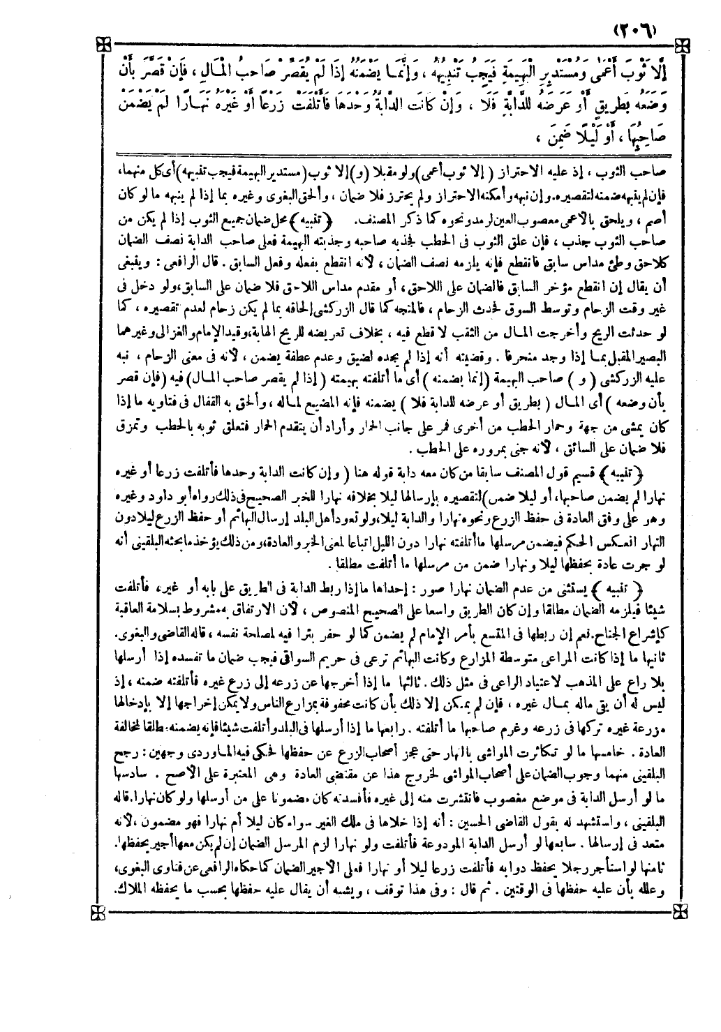 ثانيها ما إذا كانت المراعي متوسطة المزارع وكانت البهائم ترعى في حريم السواقي فيجب ضمان ما تفسده إذا أرسلها بلا راع على المذهب لاعتياد الراعي في مثل ذلك