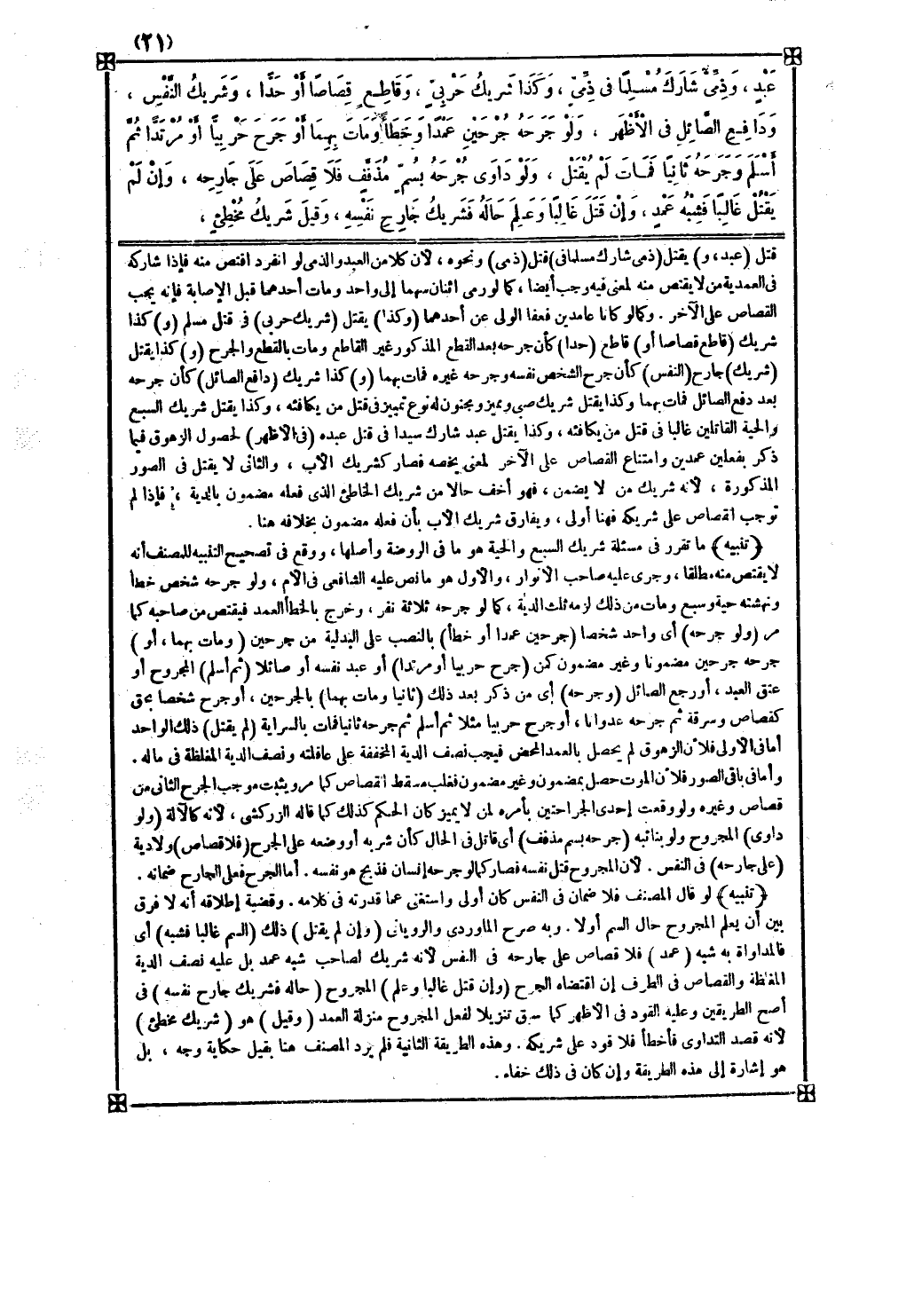 وكما لو كانا عامدين فعفا الولي عن أحدهما ( وكذا ) يقتل ( شريك حربي ) في قتل مسلم ( و ) كذا شريك ( قاطع قصاصا أو ) قاطع ( حدا ) كأن جرحه بعد القطع المذكور غير القاطع ومات بالقطع والجرح ( و ) كذا يقتل ( شريك ) جارح ( النفس ) كأن جرح الشخص نفسه وجرحه غيره فمات بهما ( و ) كذا شريك ( دافع الصائل ) كأن جرحه بعد دفع الصائل فمات بهما وكذا يقتل شريك صبي ومميز ومجنون له نوع تمييز في قتل من يكافئه وكذا يقتل شريك السبع والحية القاتلين غالبا في قتل من يكافئه وكذا يقتل عبد شارك سيدا في قتل عبده ( في الأظهر ) لحصول الزهوق فيما ذكر بفعلين عمدين وامتناع القصاص على الآخر لمعنى يخصه فصار كشريك الأب والثاني لا يقتل في الصور المذكورة لأنه شريك من لا يضمن فهو أخف حالا من شريك الخاطىء الذي فعله مضمون بالدية فإذا لم توجب القصاص على شريكه فهنا أولى ويفارق شريك الأب بأن فعله مضمون بخلافه هنا