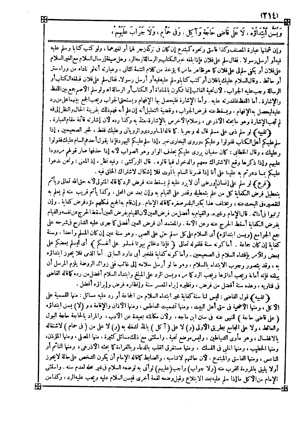 و (لا) يسن ابتداؤه (على قاضي حاجة) للنهي عنه في سنن ابن ماجه ولأن مكالمته بعيدة عن الأدب والمراد بالحاجة البول والغائط ولا على المجامع بطريق الأولى (و) لا على (آكل) بالمد لشغله به (و) لا على من (في حمام) لاشتغاله بالاغتسال وهو مأوى الشياطين وليس موضع تحية