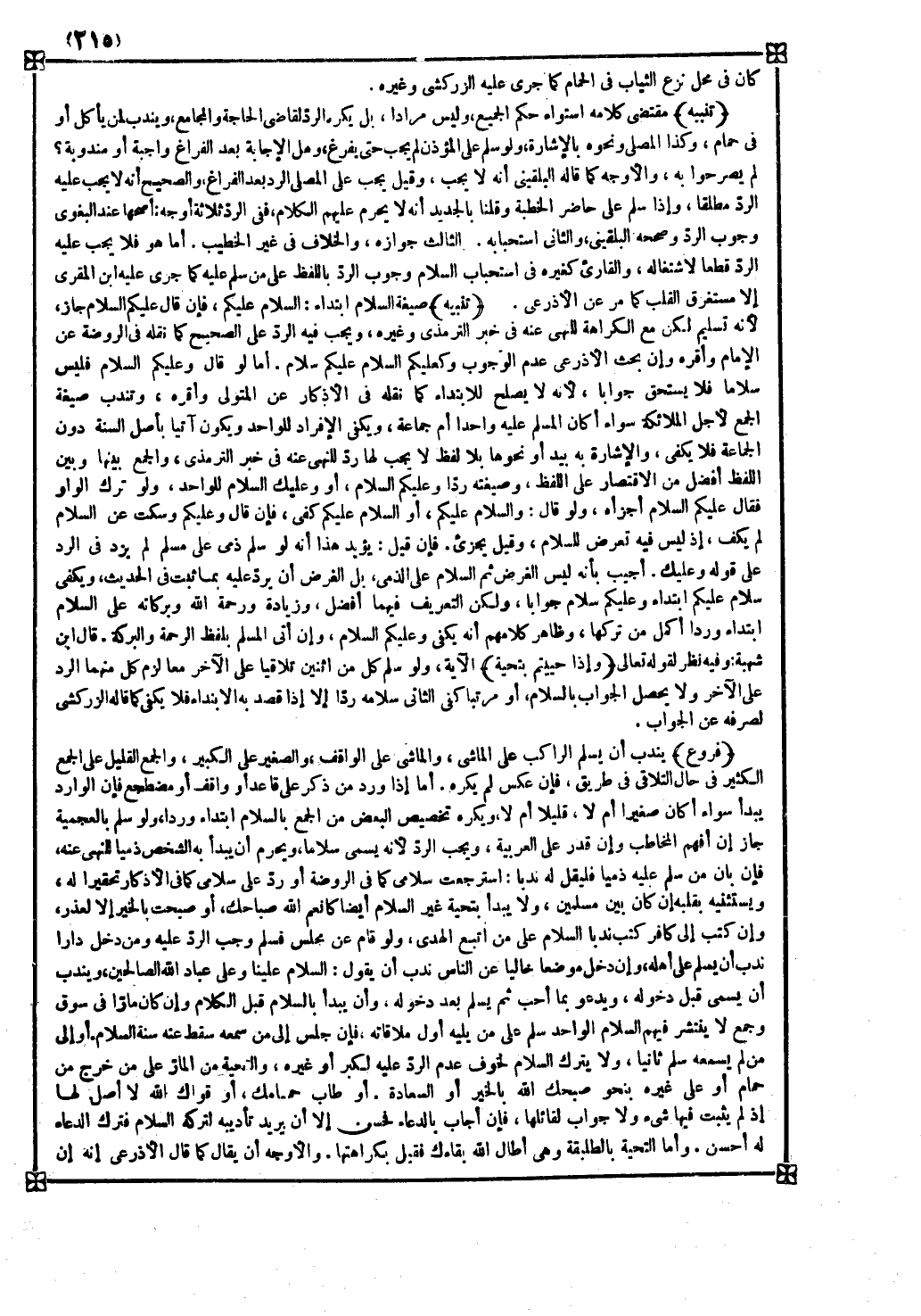 فروع يندب أن يسلم الراكب على الماشي والماشي على الواقف والصغير على الكبير والجمع القليل على الجمع الكثير في حال التلاقي في طريق فإن عكس لم يكره