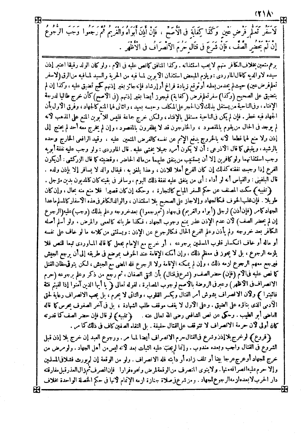 ورجوع العبد إن خرج بلا إذن قبل الشروع في القتال واجب وبعده مندوب وإنما لم يجب عليه الثبات بعد لأنه ليس من أهل الجهاد ولو مرض من خرج للجهاد أو عرج عرجا بينا أو تلف زاده أو دابته فله الانصراف ولو من الوقعة إن لم يورث فشلا في المسلمين وإلا حرم عليه انصرافه منها ولا ينوي المنصرف من الوقعة لمرض ونحوه فرارا فإن انصرف ثم زال العذر قبل مفارقته دار الحرب لا بعده لزمه الرجوع للجهاد