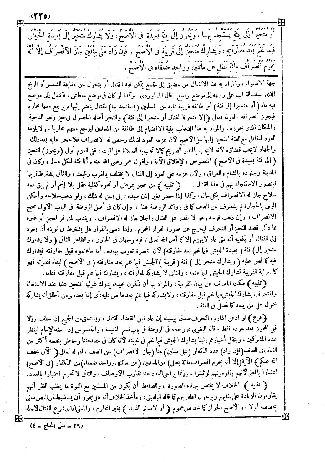 تنبيه من عجز بمرض أو نحوه كغلبة عقل بلا إثم أو لم يبق معه سلاح جاز له الانصراف بكل حال وكذا إذا حضر بغير إذن سيده بل يسن له ذلك ولو ذهب سلاحه وأمكن الرمي بالحجارة لم ينصرف عن الصف كما في زائد الروضة هنا وإن كان في أصل الروضة في الباب الأول صحح الانصراف وإن ذهب فرسه وهو لا يقدر على القتال راجلا جاز له الانصراف ويندب لمن فر لعجز أو غيره مما ذكر قصد التحيز أو التحرف ليخرج عن صورة الفرار المحرم وإذا عصى بالفرار هل يشترط في توبته أن يعود إلى القتال أو يكفيه أنه متى عاد لا ينهزم إلا كما أمر الله تعالى فيه وجهان في الحاوي والظاهر الثاني