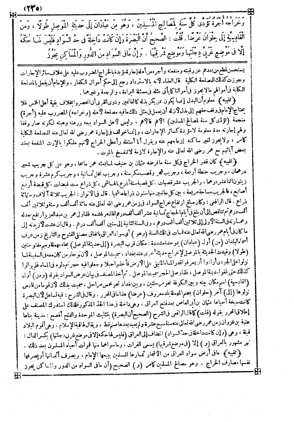 قال الرافعي وكان مبلغ ارتفاع خراج السواد في زمن عمر رضي الله تعالى عنه مائة ألف ألف وستة وثلاثين ألف ألف درهم ثم تناقص إلى أن بلغ في أيام الحجاج ثمانية عشر ألف ألف درهم لظلمه وغشمه فلما ولي عمر بن عبد العزيز ارتفع بعدله وعمارته في السنة الأولى إلى ثلاثين ألف ألف درهم وفي السنة الثانية إلى ستين ألف ألف درهم وقال إن عشت لأزيدنه إلى ما كان في أيام عمر رضي الله تعالى عنه فمات في تلك السنة