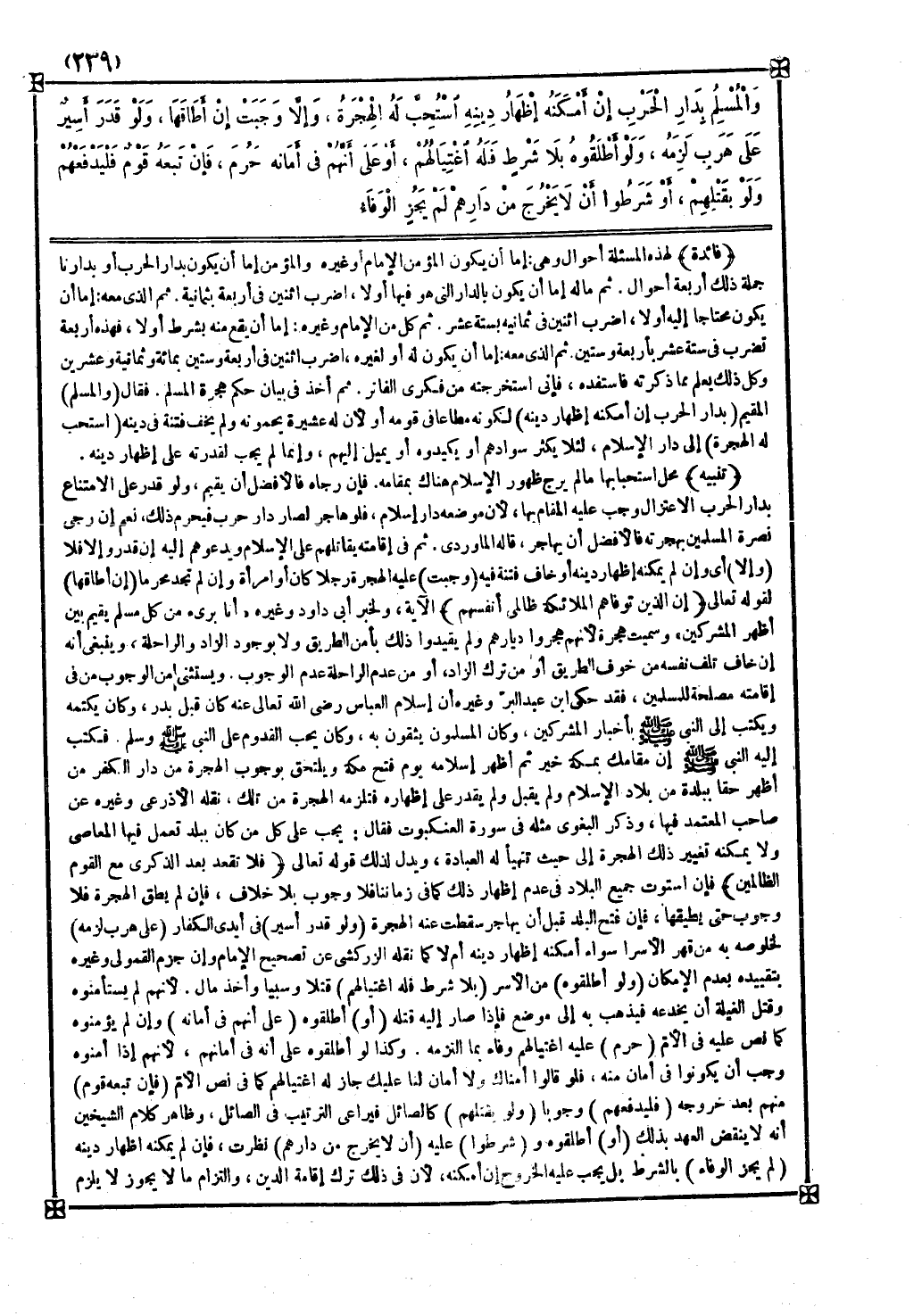 ثم أخذ في بيان حكم هجرة المسلم فقال ( والمسلم ) المقيم ( بدار الحرب إن أمكنه إظهار دينه ) لكونه مطاعا في قومه أو لأن له عشيرة يحمونه ولم يخف فتنة في دينه ( استحب له الهجرة ) إلى دار الإسلام لئلا يكثر سوادهم أو يكيدوه أو يميل إليهم وإنما لم يجب لقدرته على إظهار دينه
