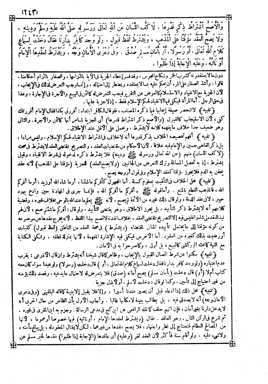 تنبيه أفهم تخصيصه الخلاف بذكر قدرها أنه لا خلاف في اشتراط الانقياد لحكم الإسلام وليس مرادا بل ذكر القاضي حسين والإمام فيه خلافا لأن الأحكام من مقتضيات العقد والتصريح بمقتضى العقد لا يشترط في صحته ( لا كف اللسان ) منهم ( عن الله تعالى ورسوله صلى الله عليه وسلم ودينه ) فلا يشترط ذكره لدخوله في شرط الانقياد وقيل يشترط إذ به تحصل المسالمة وترك التعرض من الجانبين ( ولا يصح العقد ) للجزية ( مؤقتا على المذهب ) لأنه عقد يحقن به الدم فلا يجوز مؤقتا كعقد الإسلام وفي قول أو وجه يصح