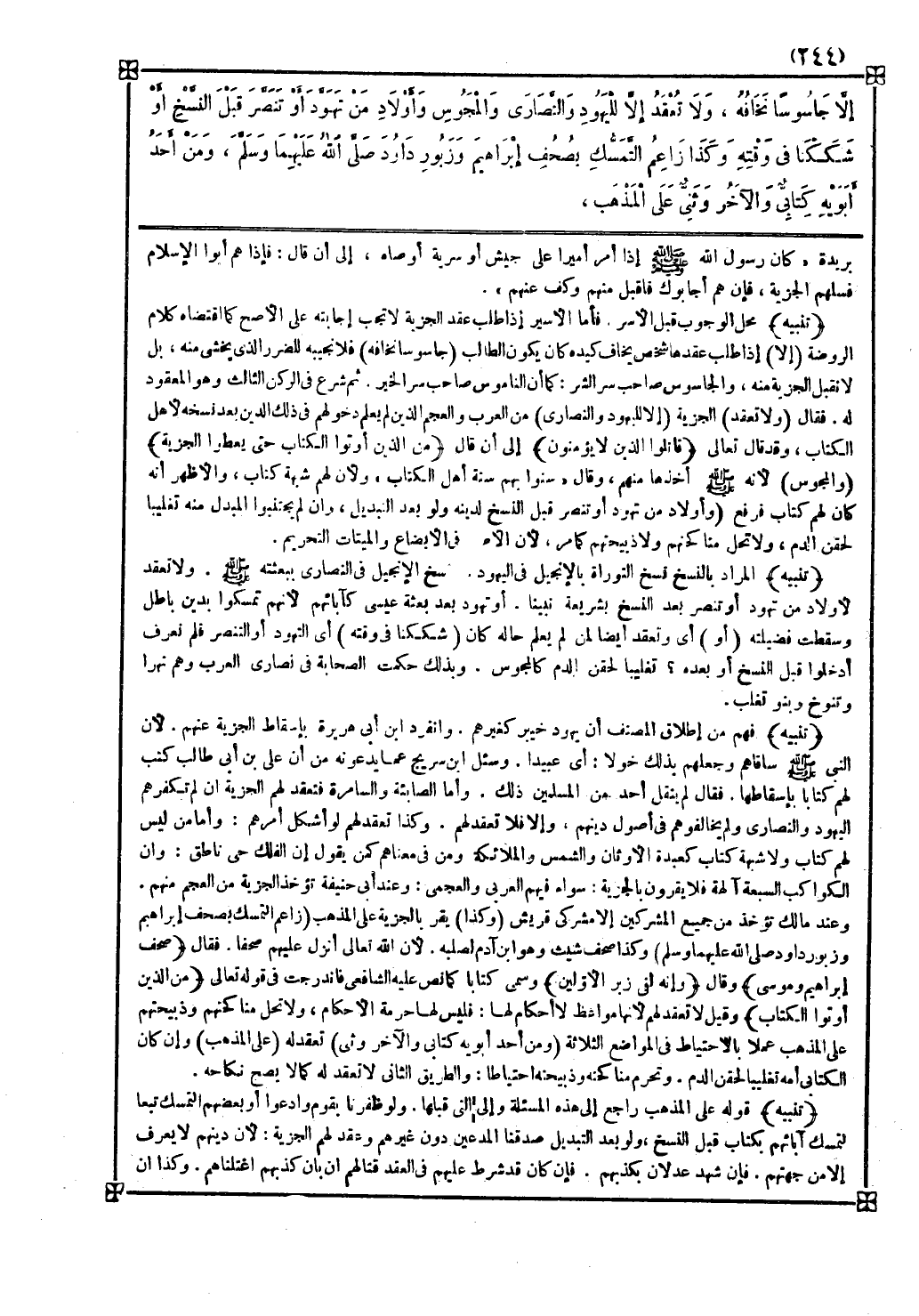 تنبيه المراد بالنسخ نسخ التوراة بالإنجيل في اليهود ونسخ الإنجيل في النصارى ببعثته صلى الله عليه وسلم ولا تعقد لأولاد من تهود أو تنصر بعد النسخ بشريعة نبينا أو تهود بعد بعثة عيسى كآبائهم لأنهم تمسكوا بدين باطل وسقطت فضيلته
