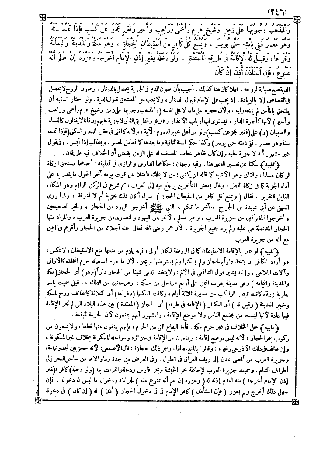 تنبيه محل الخلاف في غير حرم مكة فأما البقاع التي من الحرم فإنهم يمنعون منها قطعا ولا يمنعون من ركوب بحر الحجاز لأنه ليس موضع إقامة ويمنعون من الإقامة في جزائره وسواحله المسكونة بخلاف غير المسكونة وإن خالف في ذلك الأذرعي وغيره وقالوا بالمنع مطلقا وسمي ذلك حجازا قال الأصمعي لأنه حجز بين نجد وتهامة وجزيرة العرب من أقصى عدن إلى ريف العراق في الطول وفي العرض من جدة وما والاها من ساحل البحر إلى أطراف الشام وسميت جزيرة العرب لإحاطة بحر الحبشة وبحر فارس ودجلة والفرات بها