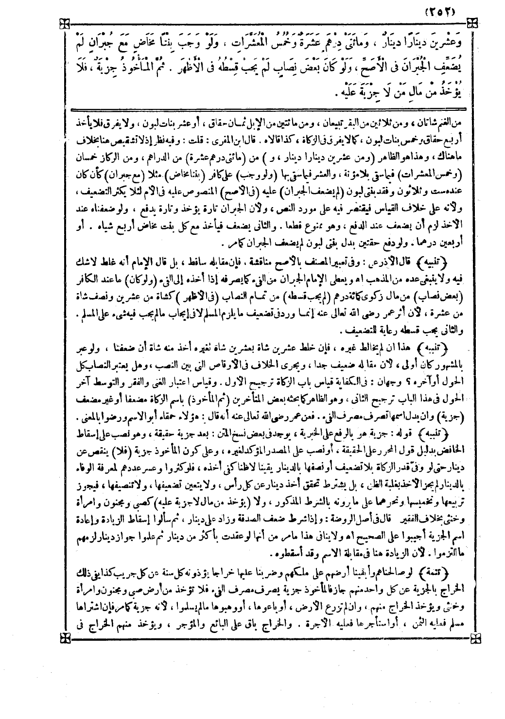 قال ابن المقري قلت وفيه نظر إذ لا تشقيص هنا بخلاف ما هناك وهذا هو الظاهر ( وعشرين دينارا دينار و ) من ( مائتي درهم عشرة ) من الدراهم ومن الركاز خمسان ( وخمس المعشرات ) فيما سقى بلا مؤنة والعشر فيما سقى بها ( ولو وجب ) على كافر ( بنتا مخاض ) مثلا ( مع جبران ) كأن كان عنده ست وثلاثون وفقد بنتي لبون ( لم يضعف الجبران ) عليه ( في الأصح ) المنصوص عليه في الأم لئلا يكثر التضعيف ولأنه على خلاف القياس فيقتصر فيه على مورد النص ولأن الجبران تارة يؤخذ وتارة يدفع ولو ضعفناه عند الأخذ لزم أن يضعف عند الدفع وهو ممنوع قطعا
