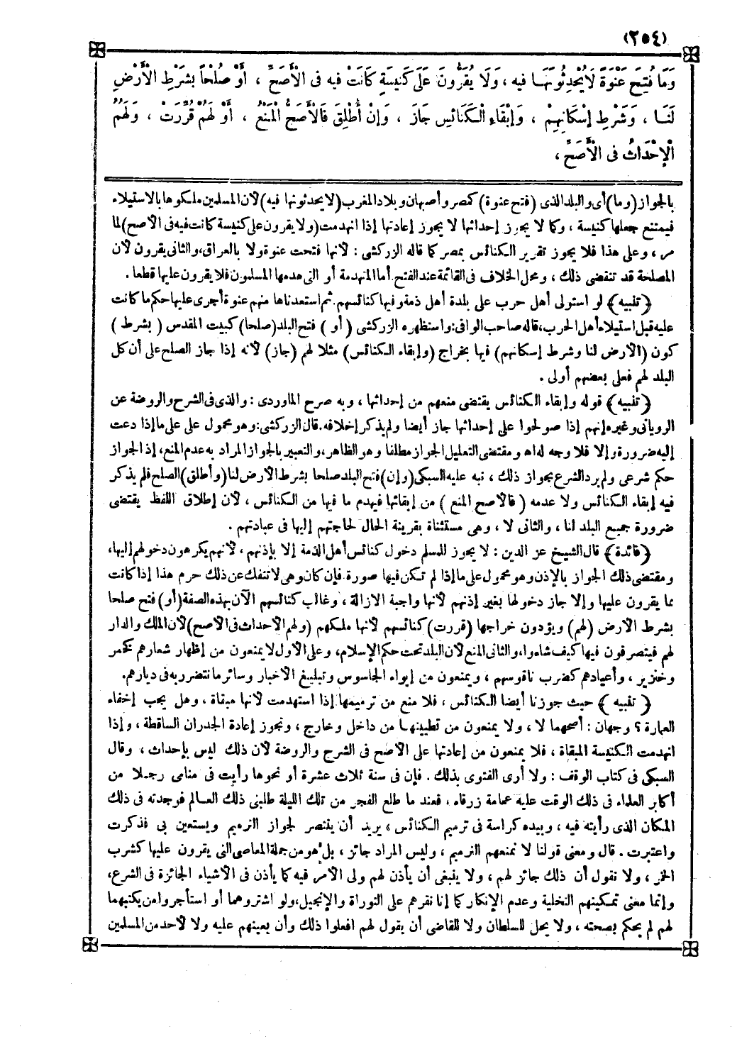 تنبيه حيث جوزنا أيضا الكنائس فلا منع من ترميمها إذا استهدمت لأنها مبقاة وهل يجب إخفاء العمارة وجهان أصحهما لا ولا يمنعون من تطيينها من داخل وخارج وتجوز إعادة الجدران الساقطة وإذا انهدمت الكنيسة المبقاة فلا يمنعون من إعادتها على الأصح في الشرح والروضة لأن ذلك ليس بإحداث وقال السبكي في كتاب الوقف ولا أرى الفتوى بذلك فإن في سنة ثلاث عشرة أو نحوها رأيت في منامي رجلا من أكابر العلماء في ذلك الوقت عليه عمامة زرقاء فعندما طلع الفجر من تلك الليلة طلبني ذلك العالم فوجدته في ذلك المكان الذي رأيته فيه وبيده كراسة في ترميم الكنائس يريد أن ينتصر لجواز الترميم ويستعين بي فذكرت واعتبرت