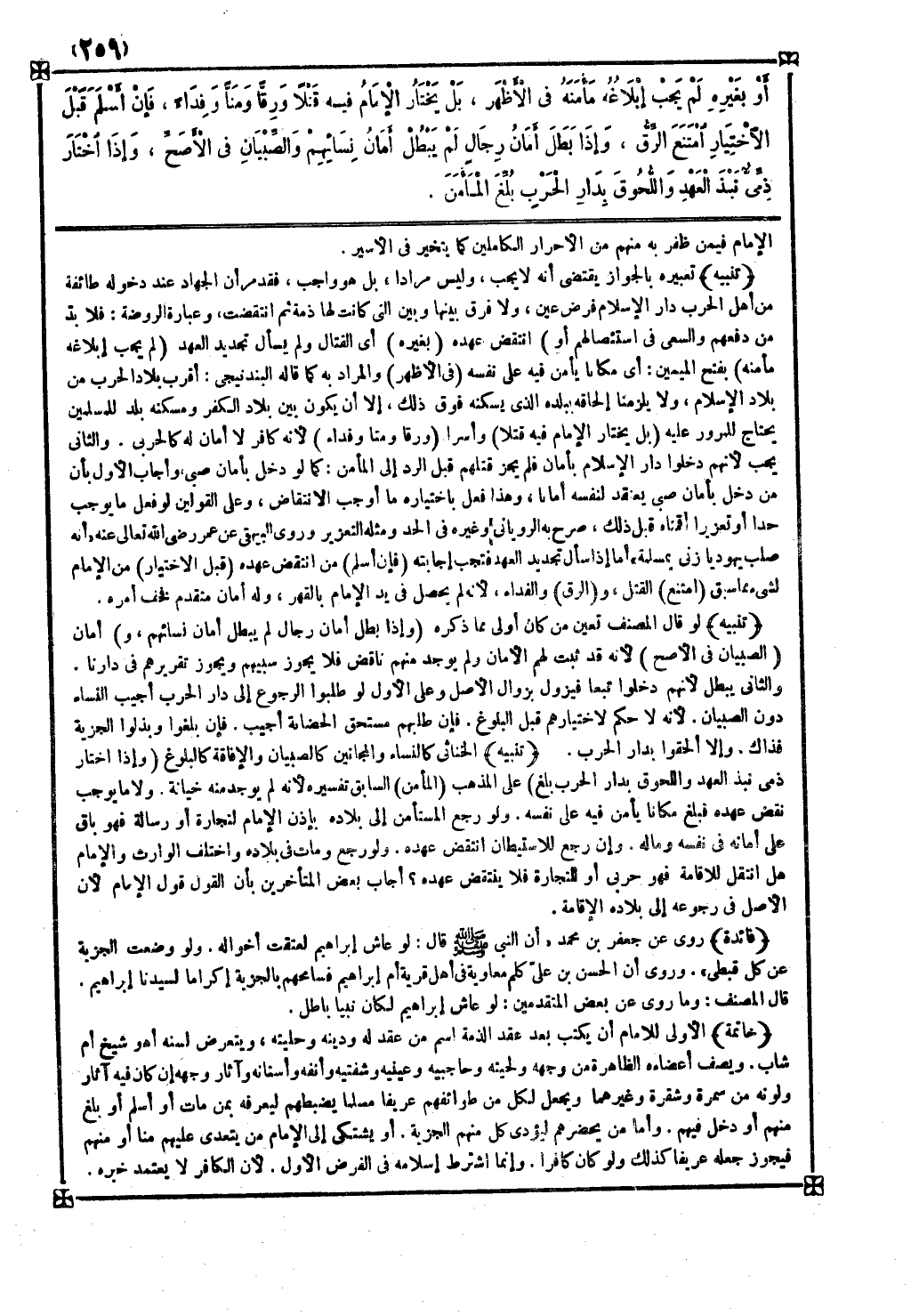 خاتمة الأولى للإمام أن يكتب بعد عقد الذمة اسم من عقد له ودينه وحليته ويتعرض لسنه أهو شيخ أم شاب ويصف أعضاءه الظاهرة من وجهه ولحيته وحاجبيه وعينيه وشفتيه وأنفه وأسنانه وآثار وجهه إن كان فيه آثار ولونه من سمرة وشقرة وغيرهما ويجعل لكل من طوائفهم عريفا مسلما يضبطهم ليعرفه بمن مات أو أسلم أو بلغ منهم أو دخل فيهم وأما من يحضرهم ليؤدي كل منهم الجزية أو يشتكي إلى الإمام من يتعدى عليهم منا أو منهم فيجوز جعله عريفا كذلك ولو كان كافرا وإنما اشترط إسلامه في الفرض الأول لأن الكافر لا يعتمد خبره