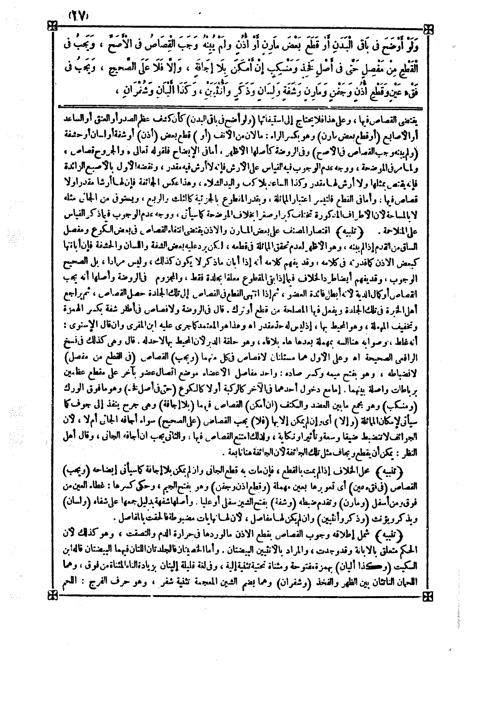 تنبيه محل الخلاف إذا لم يمت بالقطع فإن مات به قطع الجاني وإن لم يمكن بلا إجافة كما سيأتي إيضاحه ( ويجب ) القصاص ( في فقء عين ) أي تعويرها بعين مهملة ( وقطع أذن وجفن ) وهو بفتح الجيم وحكي كسرها غطاء العين من فوق ومن أسفل ( ومارن ) وتقدم ضبطه ( وشفة ) بفتح الشين سفلى أو عليا وأصلها شفهة بدليل جمعها على شفاه ( ولسان ) ويذكر ويؤنث ( وذكر وأنثيين ) وإن لم يكن لها مفاصل لأن لها نهايات مضبوطة فألحقت بالمفاصل