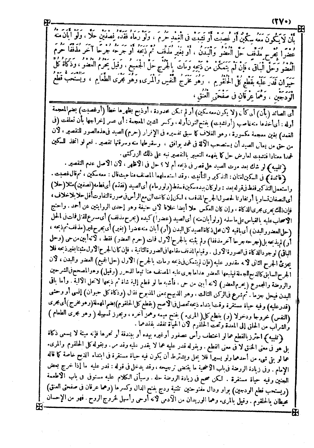 وبقوله كل الحلقوم والمريء عما لو بقي شيء من أحدهما ولو يسيرا فلا يحل ويشترط أن يكون فيه حياة مستقرة في ابتداء الذبح خاصة كما قاله الإمام