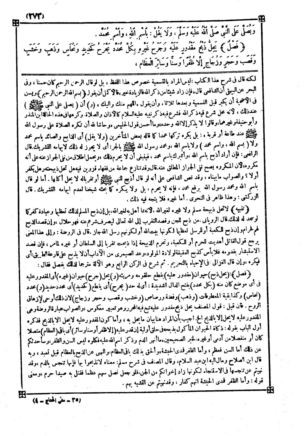 ثم شرع في الركن الرابع وهو الآلة مترجما لذلك بفصل فقال فصل ( يحل ذبح ) حيوان ( مقدور عليه ) بقطع حلقومه ومريئه ( و ) يحل ( جرح ) حيوان ( غيره ) أي المقدور عليه في أي موضع كان منه ( بكل محدد ) بفتح الدال الشديدة أي له حد ( يجرح ) أي يقطع ( كحديد ) أي محدد حديد ( و ) محدد ( نحاس ) وكذا بقية المعطوفات ( وذهب ) وفضة ورصاص ( وخشب وقصب وحجر وزجاج ) لأن ذلك أوحى لإزهاق الروح