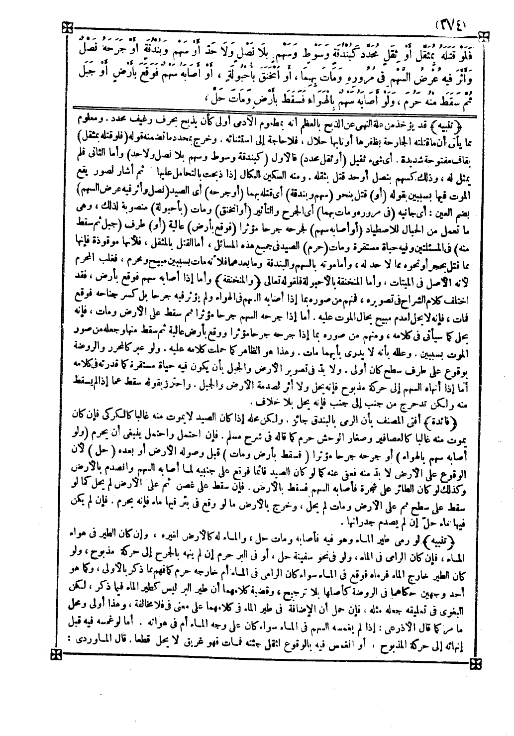 تنبيه لو رمى طير الماء وهو فيه فأصابه ومات حل والماء له كالأرض لغيره وإن كان الطير في هواء الماء فإن كان الرامي في الماء ولو في نحو سفينة حل أو في البر حرم إن لم ينهه بالجرح إلى حركة مذبوح ولو كان الطير خارج الماء فرماه فوقع في الماء سواء كان الرامي في الماء أم خارجه حرم كما فهم مما ذكر بالأولى وكما هو أحد وجهين حكاهما في الروضة كأصلها بلا ترجيح وقضية كلامهما أن طير البر ليس كطير الماء فيما ذكر لكن البغوي في تعليقه جعله مثله فإن حمل أن الإضافة في طير الماء في كلامهما على معنى في فلا مخالفة وهذا أولى ومحل ما مر كما قال الأذرعي إذا لم يغمسه السهم في الماء سواء كان على وجه الماء أم في هواته أما لو غمسه فيه قبل إنهائه إلى حركة المذبوح أو انغمس فيه بالوقوع لثقل جثته فمات فهو غريق لا يحل قطعا
