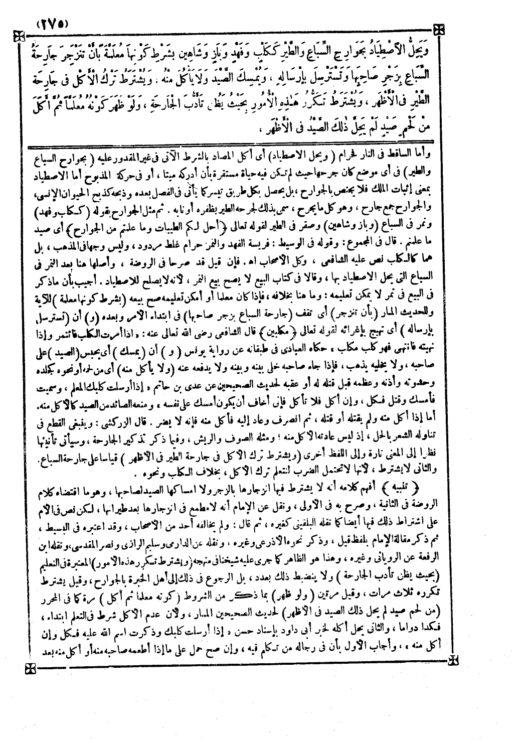 ( ويحل الاصطياد ) أي أكل المصاد بالشرط الآتي في غير المقدور عليه ( بجوارح السباع والطير ) في أي موضع كان جرحها حيث لم تكن فيه حياة مستقرة بأن أدركه ميتا أو في حركة المذبوح أما الاصياد بمعنى إثبات الملك فلا يجتص بالجوارح بل يحصل بكل طريق تيسر كما يأتي في الفصل بعده وذبحه كذبح الحيوان الإنسي والجوارح جمع جارح وهو كل ما يجرح سمي بذلك لجرحه الطير بظفره أو نابه